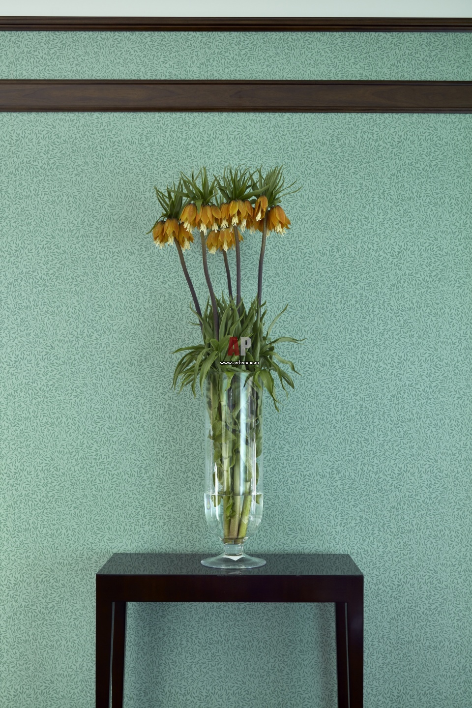 Стены гостиной оформлены обоями прохладного мятного цвета в стилистике модерна. Обои, Morris & Co.