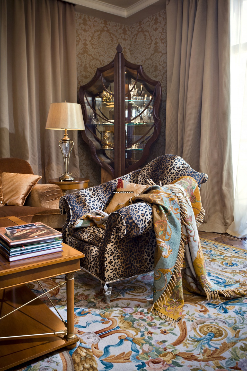 Фото интерьера гостиной двухуровневой квартиры в стиле неоклассика