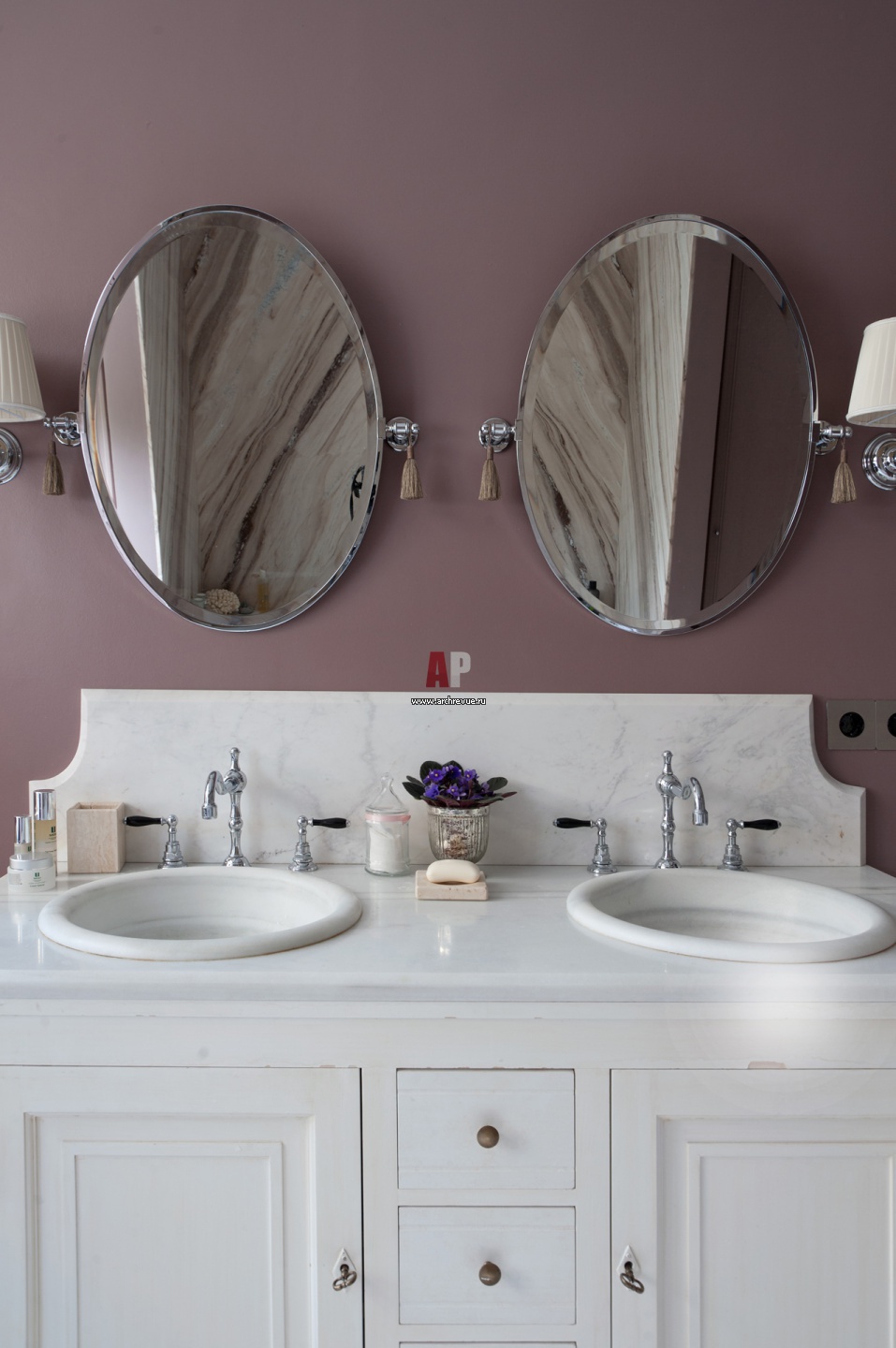 На фото – интерьер ванной комнаты. Умывальник из дерева под белой эмалью со сглаженными углами на две раковины. Композицию из двух круглых раковин подчеркивают овальные зеркала. Раковины, Villeroy & Boch.