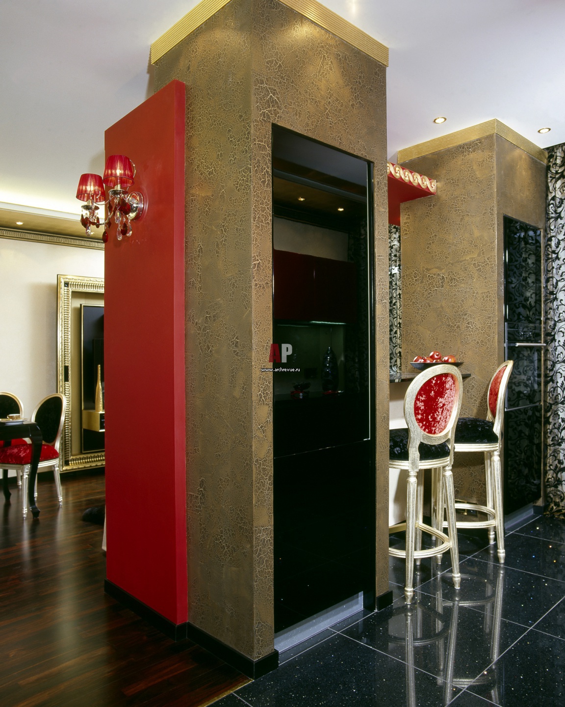 В декоративные колонны на кухне встроены холодильник и бытовая техника под черным стеклом. Между ними размещена барная стойка.