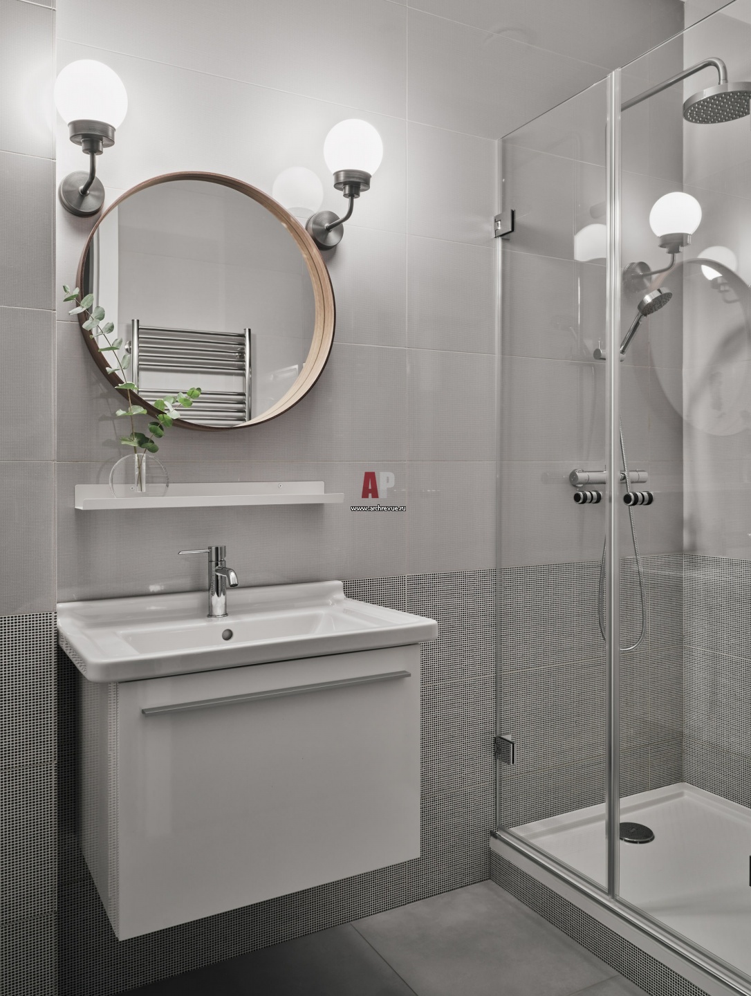 Интерьер санузла с душевой выполнен в спокойной светлой палитре. Умывальник и тумба, Duravit.