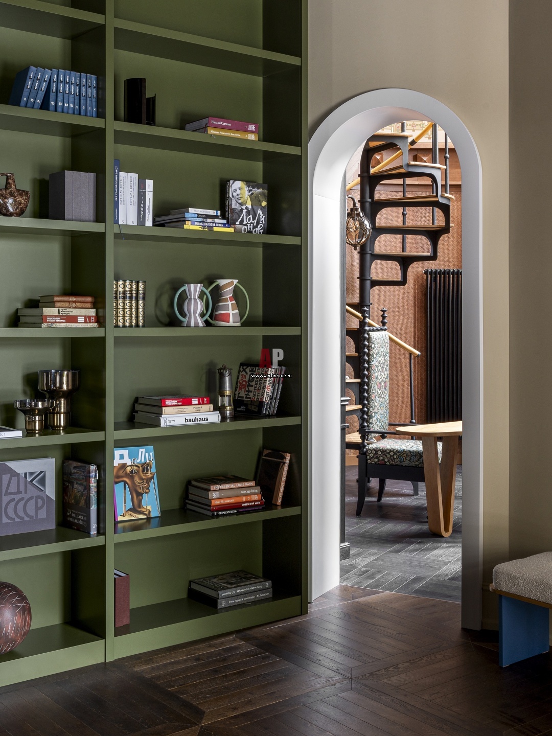 Эклектичный дом с элементами русского модерна. Вид из гостиной через арочный проем на кабинет.