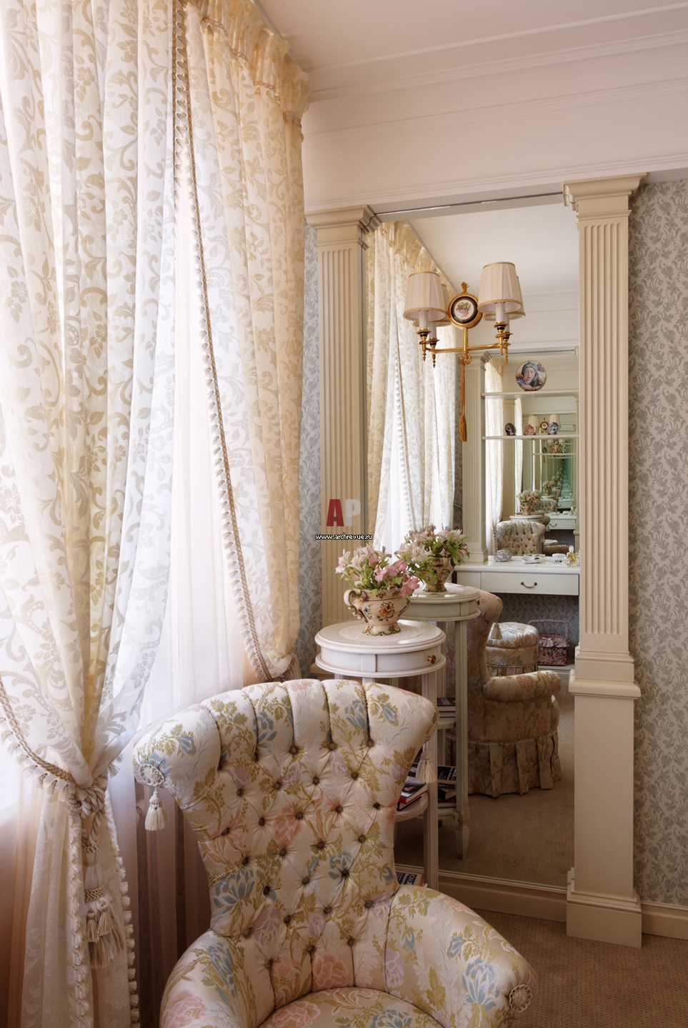 Небольшое по площади помещение спальни зрительно увеличено зеркалами. Мягкие пастельные тона текстильных обоев и деревянного декора развиваются в текстильном оформлении. На полу спальни, как и во всей приватной части квартиры ковровое покрытие