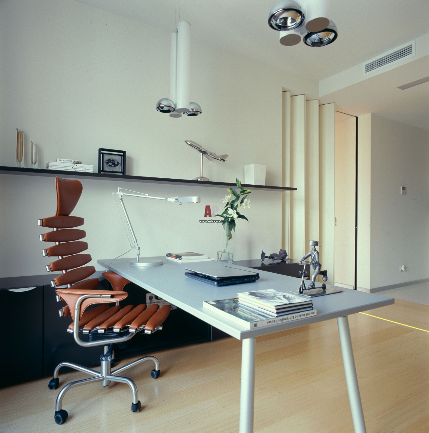 Кабинет расположен в предпоследнем отсеке, рядом со спальней. Раздвижные звукоизолирующие перегородки превращают его в отдельное закрытое помещение. Кресло, De Sede. Стол, Interluebke.