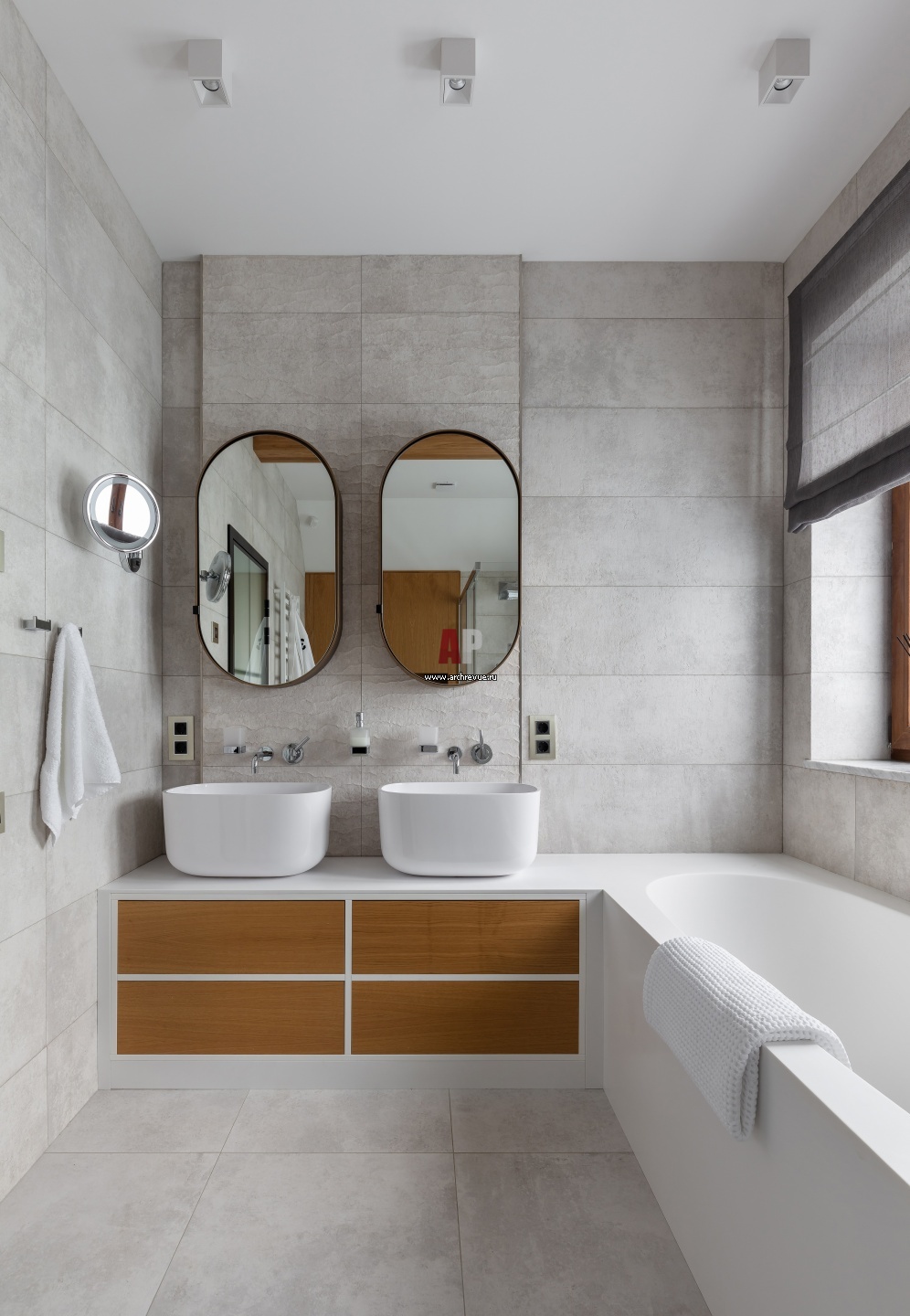 Хозяйская ванная комната оформлена светлым керамогранитом под мрамор. Раковины, зеркала, Ceramica Cielo.