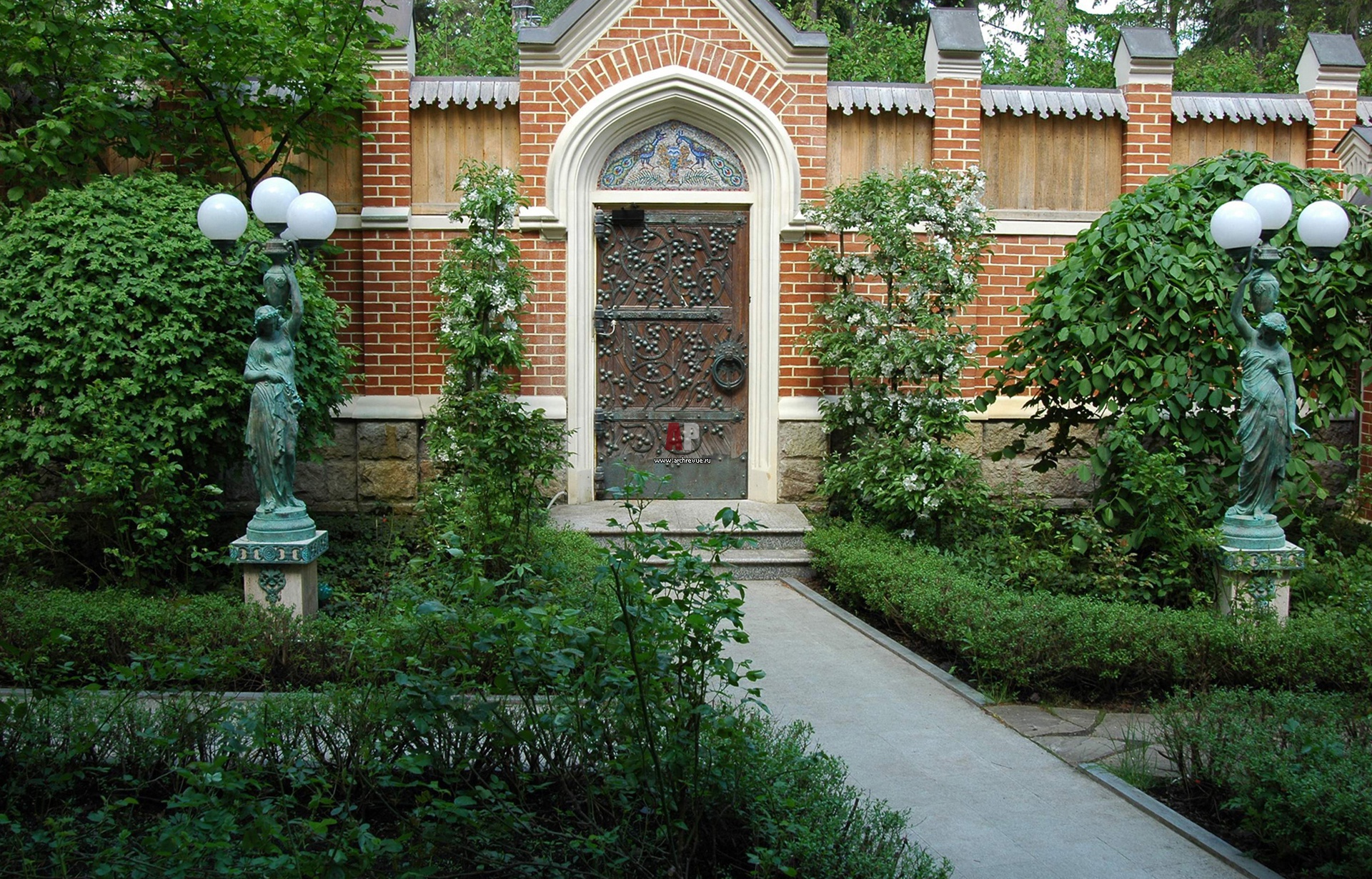 Сад выглядит защищенным и очень уютным благодаря высокому забору и массивной дубовой калитке, выполненной в духе русского средневековья. Массивная дубовая дверь с металлическими накладками сверху украшена мозаичным панно с изображением былинных Жар-Птиц.