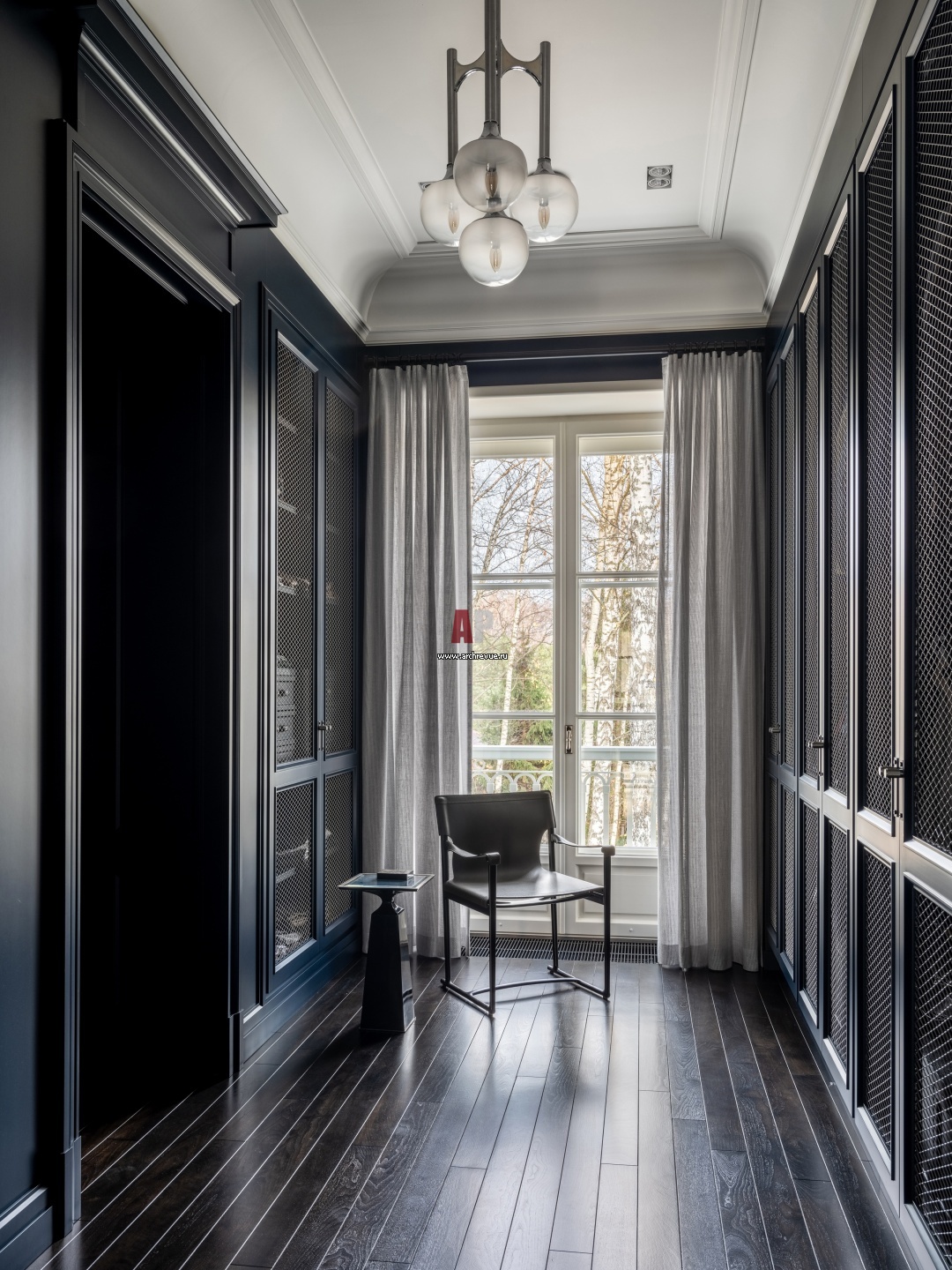 Мужская гардеробная. Шкафы и стены зашиты панелями цвета ночного неба. В филенки шкафов вместо стекла встроена металлическая сетка-рабица. Ее ячеистая структура позволяет вещам дышать, воздух в шкафах не застаивается.