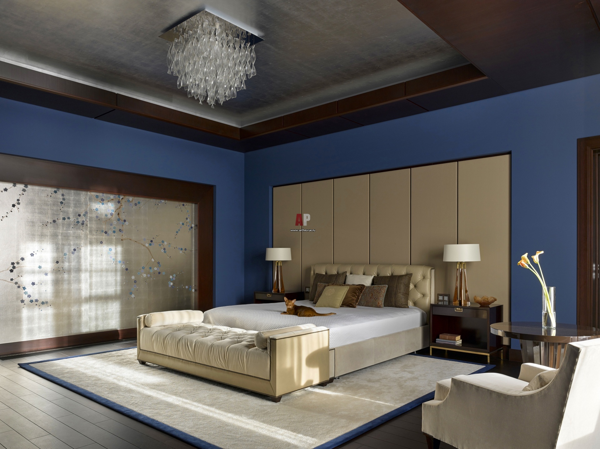 Акцентная деталь родительской, синей спальни – панно из обоев ручной работы с покрытием из стерлингового серебра, De Gournay. Мебель, светильники, Baker.