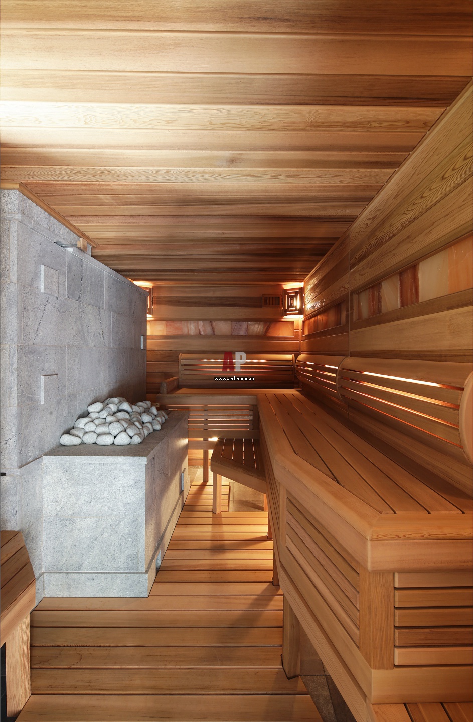 Интерьер сауны. Одна стена сложена из специального материала талькохлорит, который служит превосходным природным теплоаккумулятором.