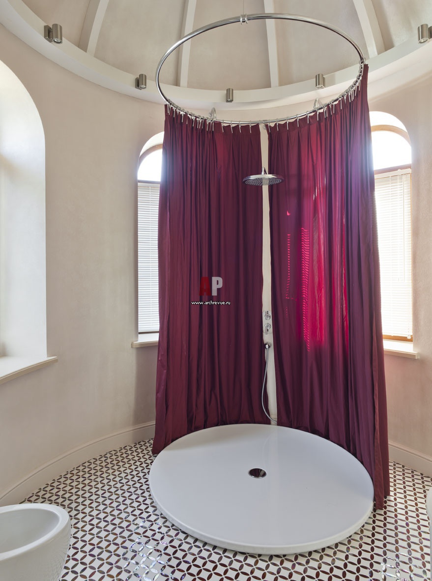 Круговая душевая с бордово-винной шторой в хозяйской ванной. Форму и расположение душевой подсказал купол и галерея арочных окон.