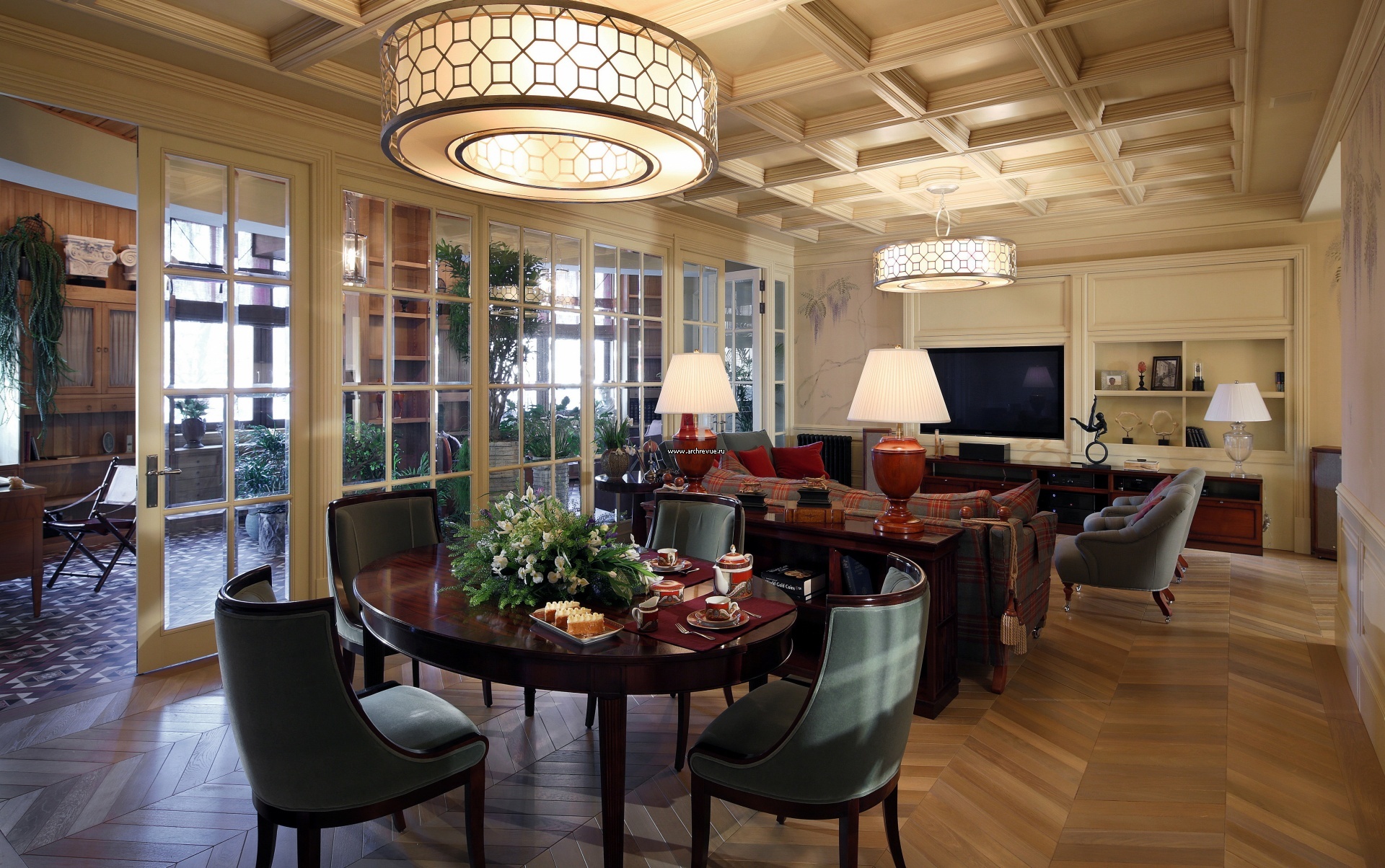 Между общей гостиной и зимним садом установлена перегородка из фацетированного стекла. Квадратные переплеты повторяют рисунок деревянных кессонов потолка. Люстры, Fine Art Lamps. Обеденный стол, стулья, Galimberti Nino.