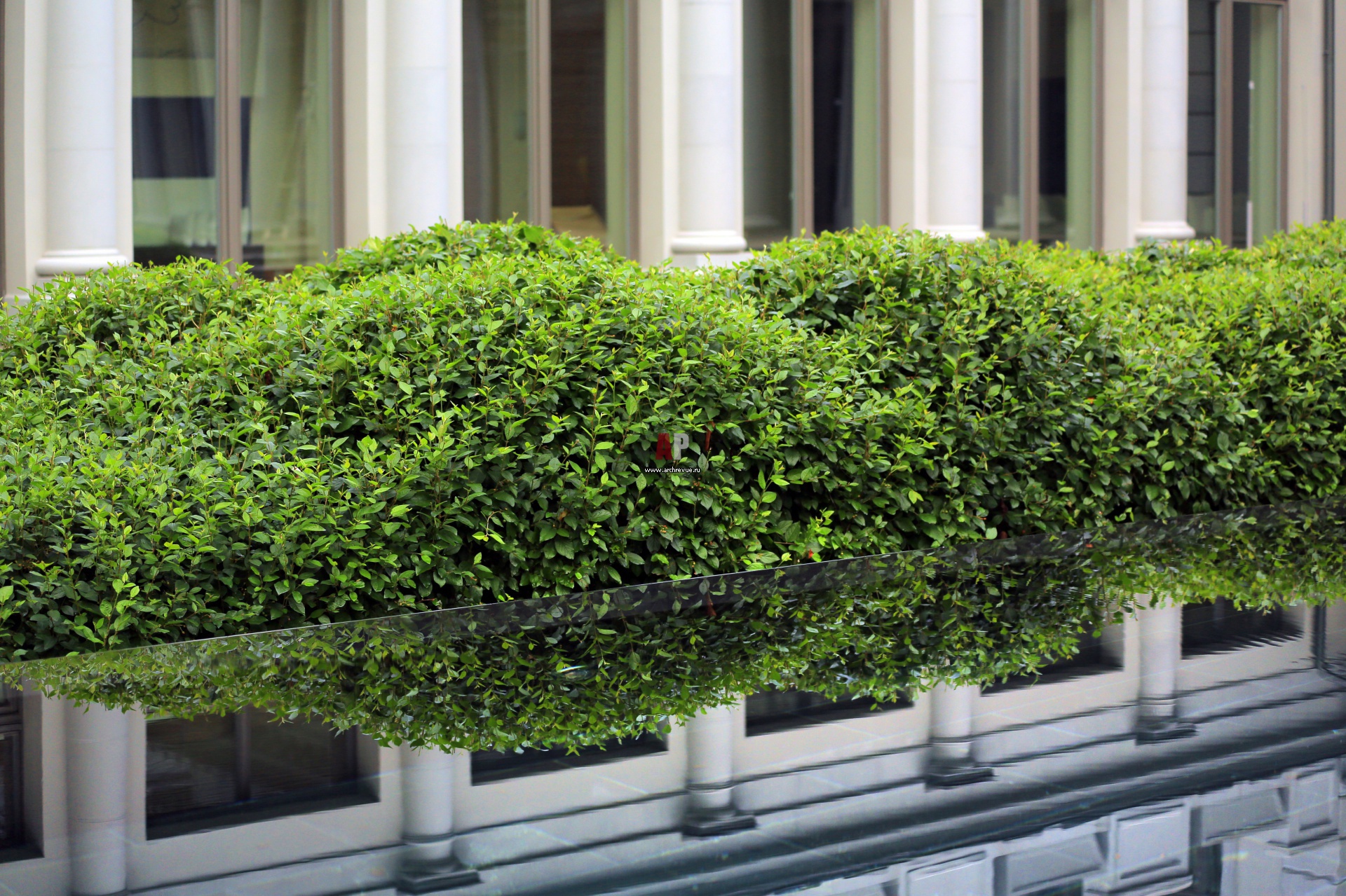 Строгую геометрию водоема, во всем соответствующую канонам классицизма, смягчает и оживляет обрамление из волнообразно подстриженных кустов кизильника, похожих на зеленые кучевые облака, повисшие над водой.