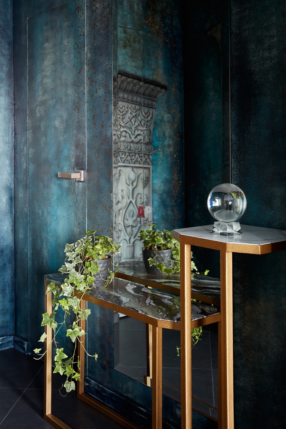 Стены прихожей оформлены ручной росписью в бирюзово-кобальтовых тонах. В декоре использованы характерные для Средней Азии мотивы и цвета.