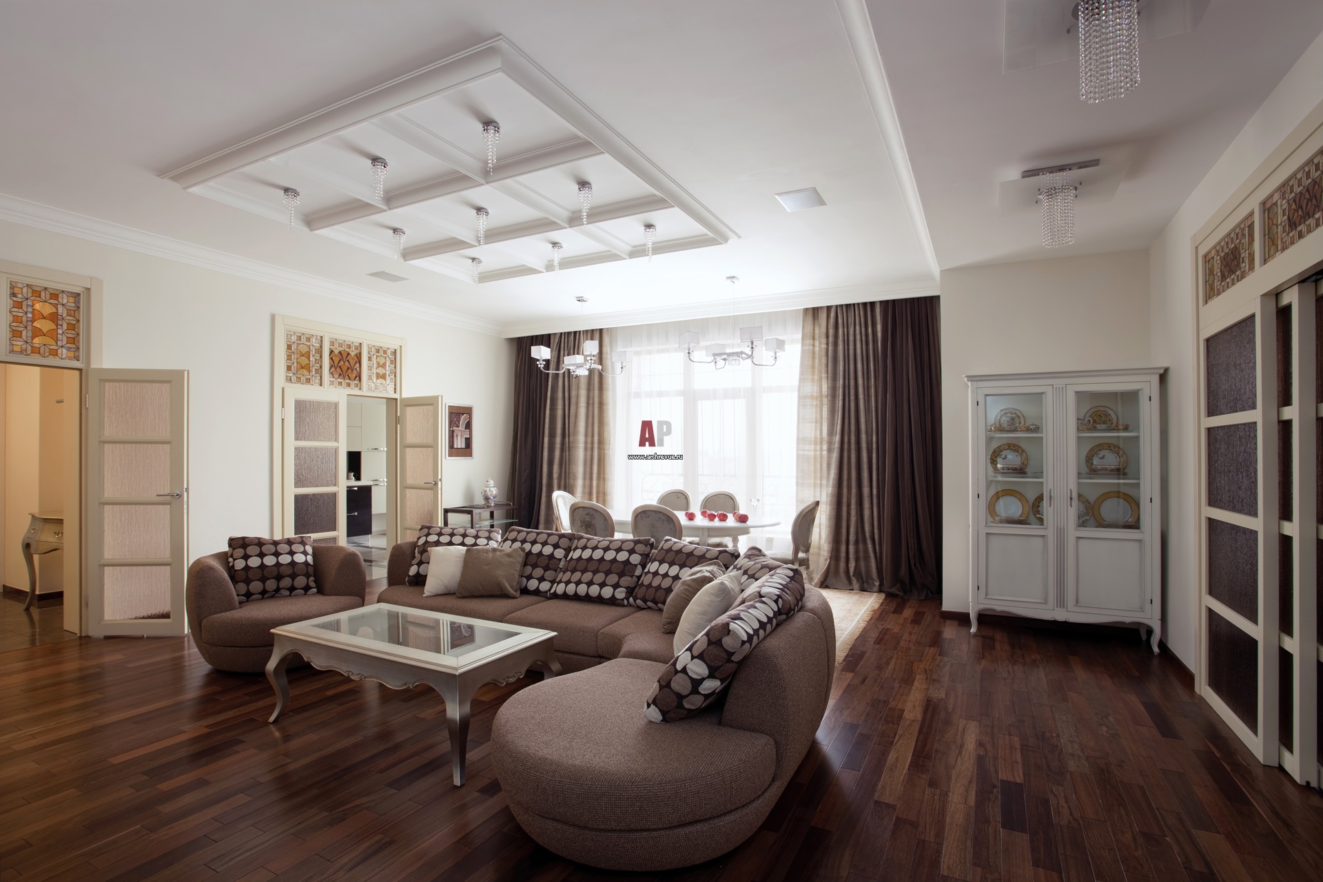 Дизайн проходной гостиной в стиле неоклассика. Диванная группа акцентирована лепным декором потолка, имитирующим классические кессоны. Стены выкрашены однотонной матовой краской молочно-белого цвета. С лаконичной отделкой стен контрастирует массивная половая доска под лаком из дуба насыщенного цвета. А также шторы и обивки диванов цвета горького и молочного шоколада.