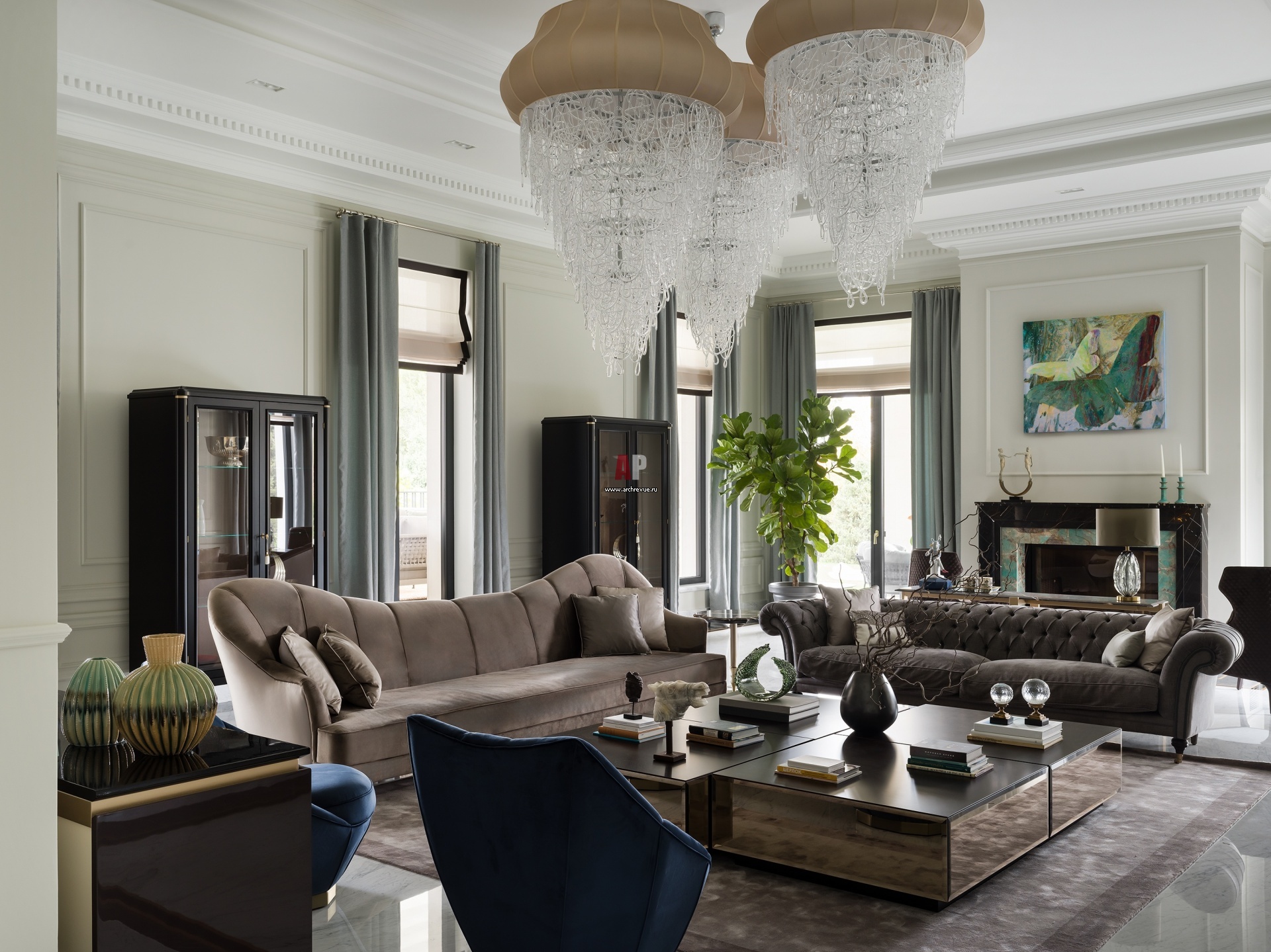 Гостиная. Большой масштаб виллы помещений подчеркивают светильники Braescu, Lasvit, Capellini.