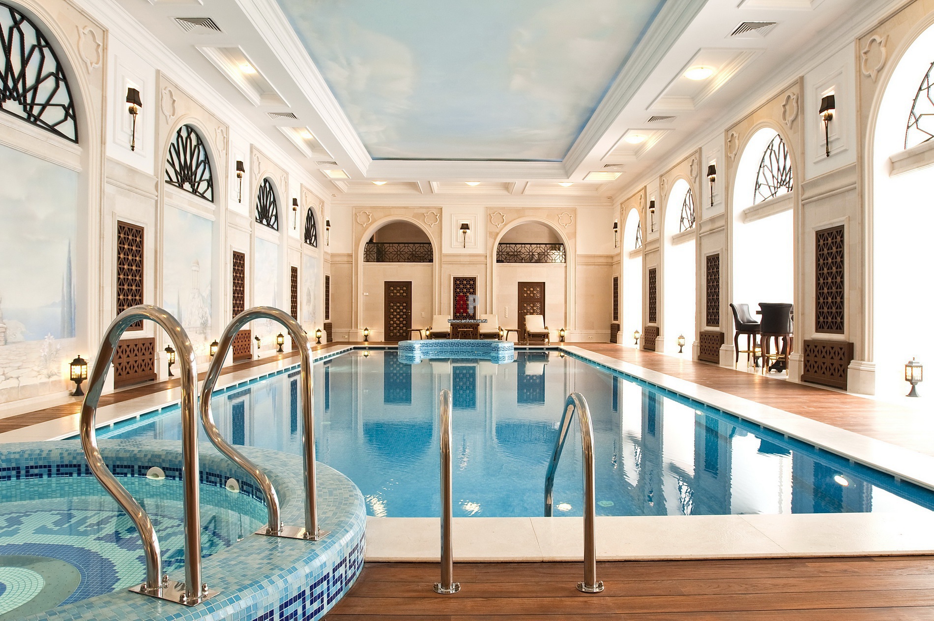 Бассейн расположен в отдельно стоящем здании. В его отделке прослеживаются арабские мотивы. Этому служат арочные окна, лепной декор, резное дерево. Стена украшает авторская роспись с изображением приморского пейзажа.