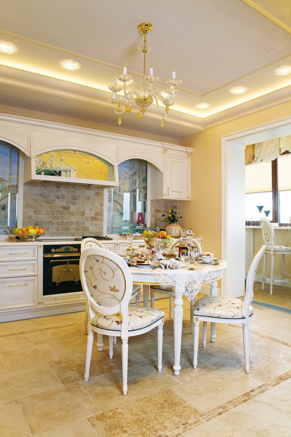 Кухня в неоклассике. На присоединенном балконе организована барная зона.