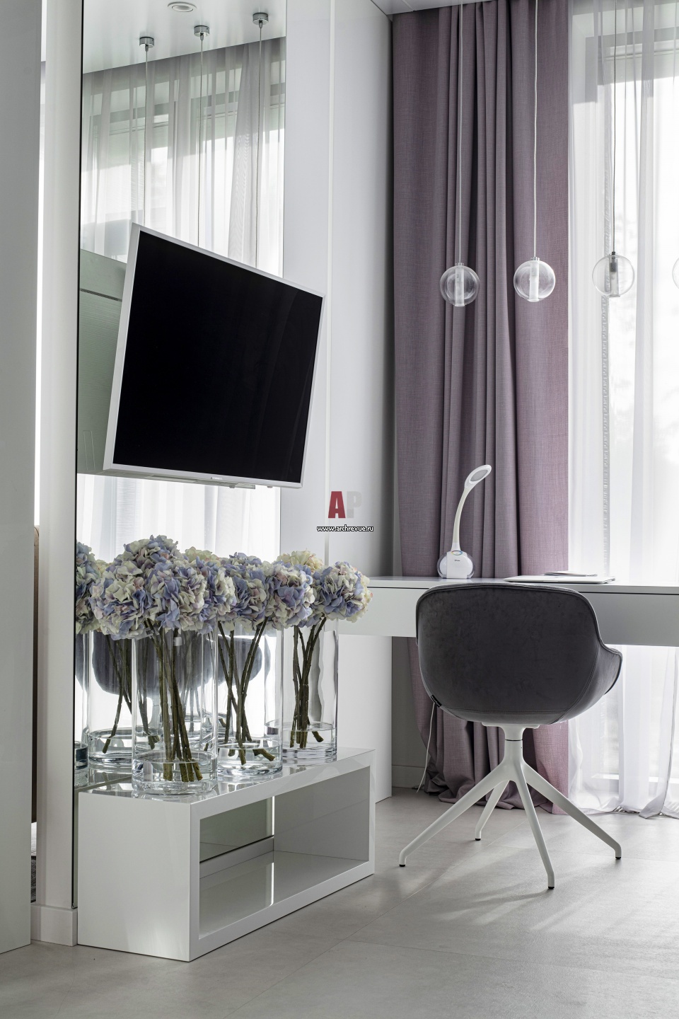 Рабочая зона в детской комнате. Сиреневые акценты усложняют белоснежный декор помещения.