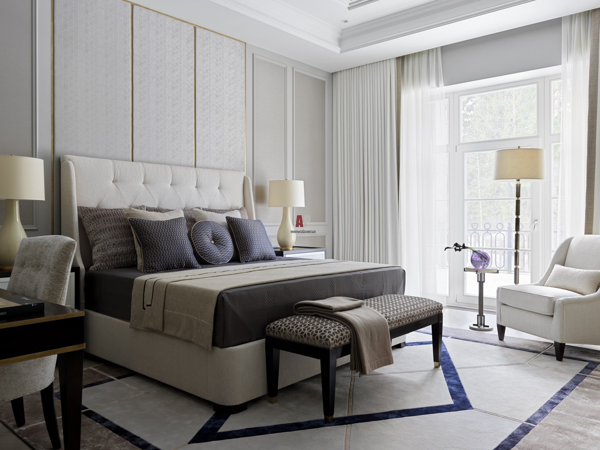 Мастер-спальня. Кровать, Mr. & Mrs. Howard. Стеновые панели за изголовьем обтянуты тканью, Dedar. Кресло, Century Furniture. Настольные лампы, Visual Comfort & Co. Шторы, Pierre Frey.