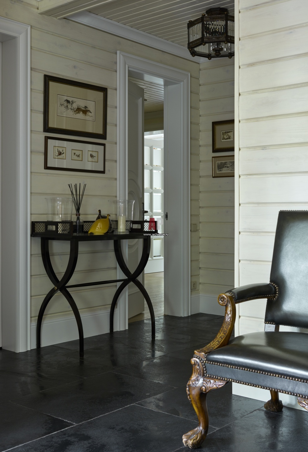 Интерьер прихожей. На полу – фактурный черный английский сланец в обработке «антик». Он работает на контрасте с белыми деревянными стенами. Кресло с резными львиными лапами и американская консоль – антикварные. За дверью находится гостевая спальня.