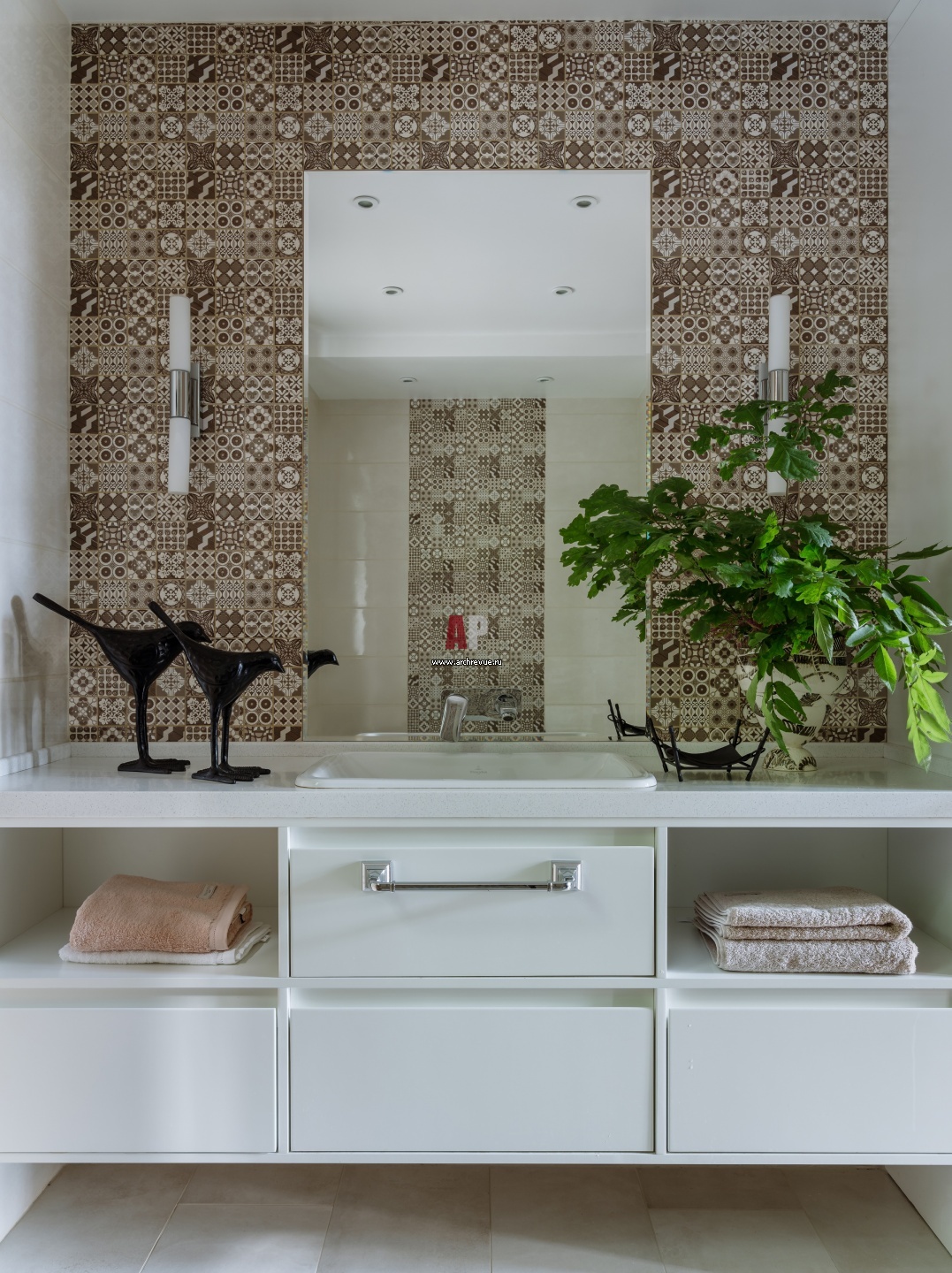 В качестве акцентов в хозяйской ванной использована плитка Dune из коллекции Canova. Заказчице очень понравился ее орнамент, впоследствии он был перенесен на резные фасады шкафов. Раковина, Villeroy & Boch. Смесители, Hansgrohe.