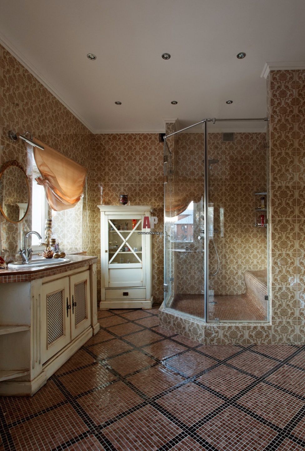 Особенность хозяйской ванной комнаты – выбеленное дерево мебели, мозаичная раскладка пола и просторная стеклянная душевая кабина.