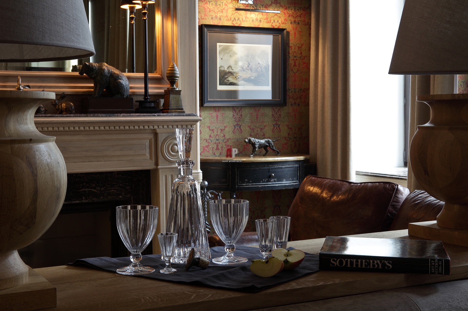 Парадное зеркало каминного короба венчает декорированный пилястрами классический портал из дерева.