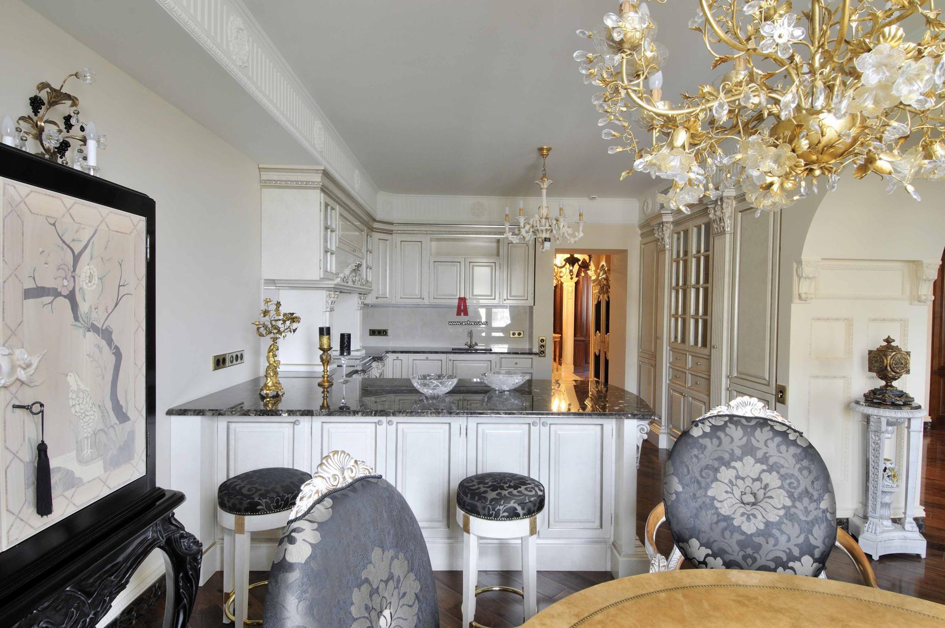 Кухня, выполненная по эскизам и чертежам автора итальянскими мастерами, является частью общей зоны. Ее, как и другие пространства квартиры, украшает лепной карниз и пилястры с резным декором. Для большего удобства сюда можно зайти прямо из холла