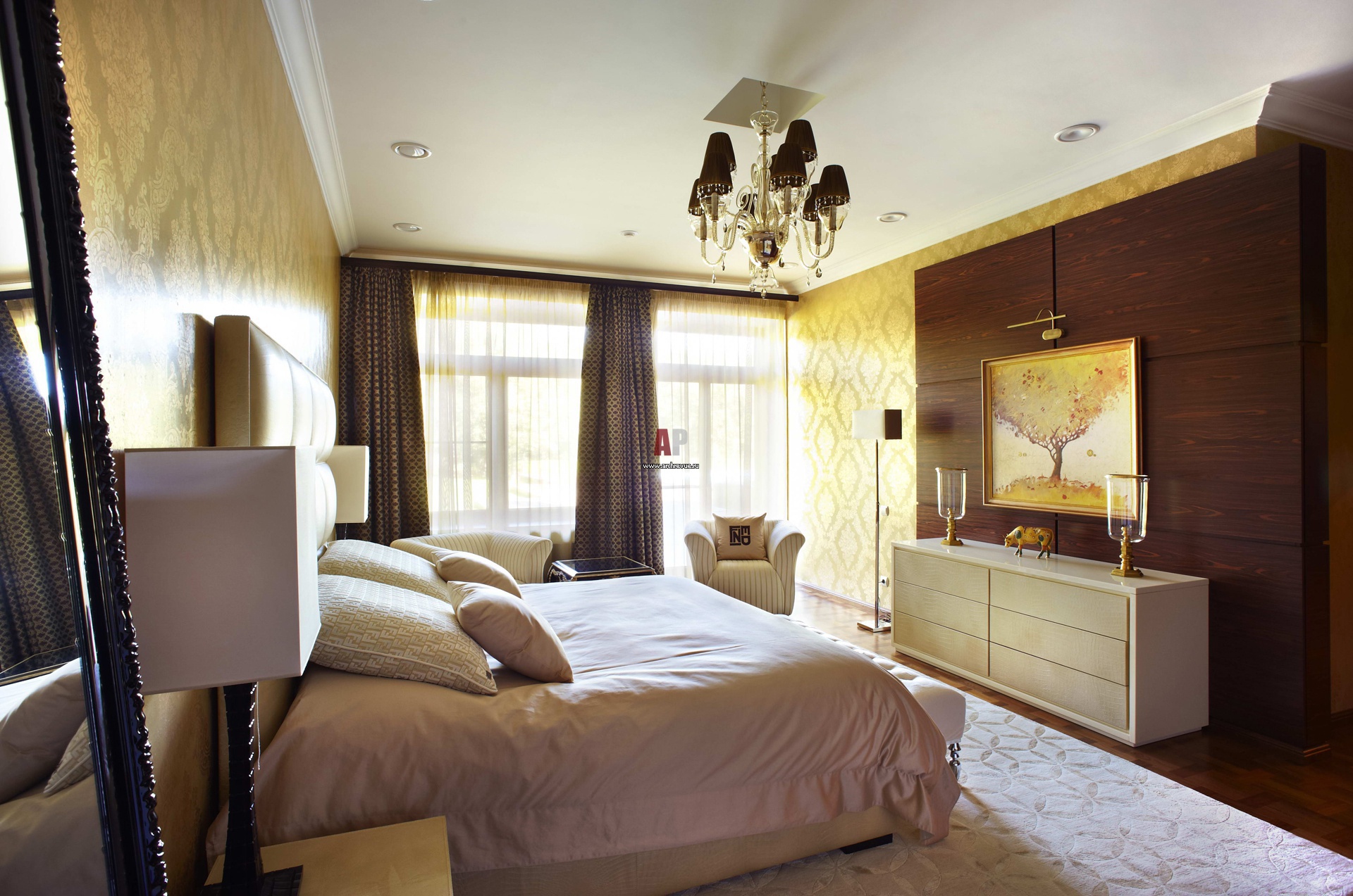 Хозяйская спальня в золотистых тонах. Металлизированные обои Arte (коллекция Metal X Glass), поставщик «Ампир Декор».