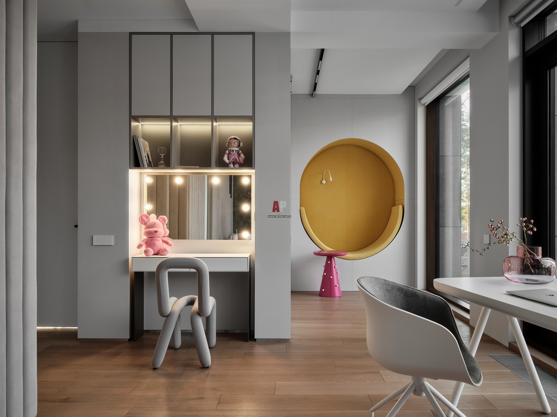 Детская дочери. Зона туалетного столика с зеркалом и шкафами. Фронтальная подсветка зеркала для макияжа. В глубине комнаты – круглая зона отдыха. Рабочий стол, встроенное кресло и столик Ko'Za Home.