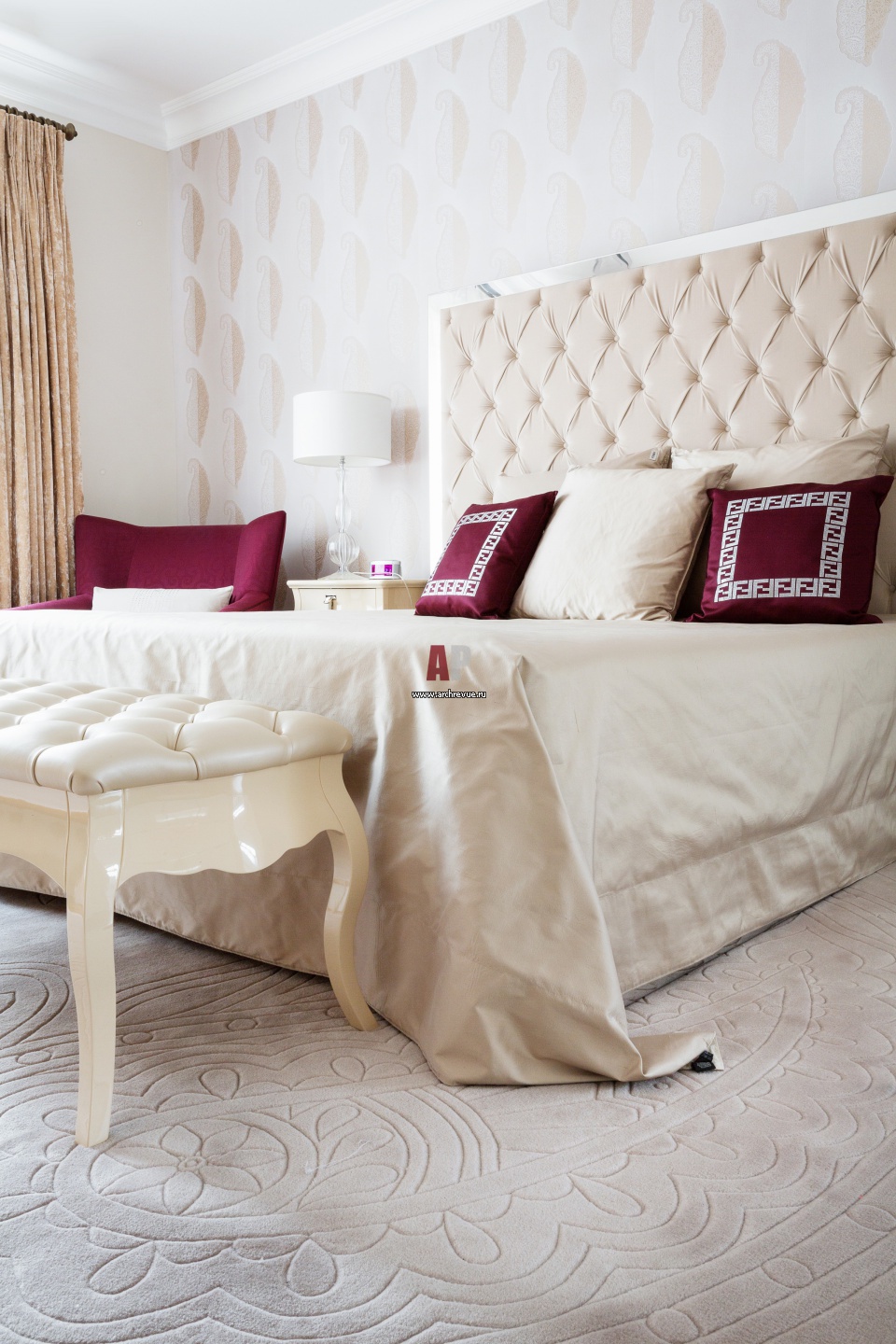Интерьер спальни в стиле современная классика выполнен в светлых кремовых тонах. Кресло возле окна и декоративные подушки исполнены в ярком брусничном цвете.