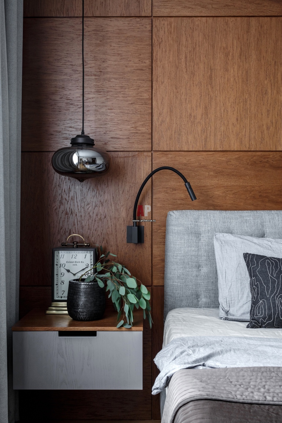 Стена за изголовьем кровати в спальне и прикроватная тумбочка сделаны на заказ по эскизам архитектора.