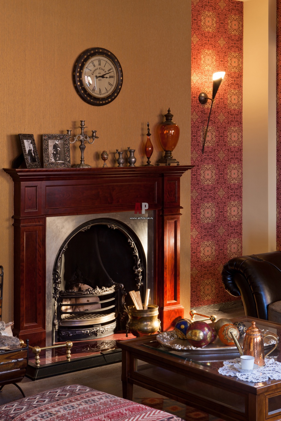 Небольшая открытая топка камина Stovax обрамлена порталом из темно-красной вишни. Топка украшена ажурным металлическим орнаментом. Обои в восточном стиле.