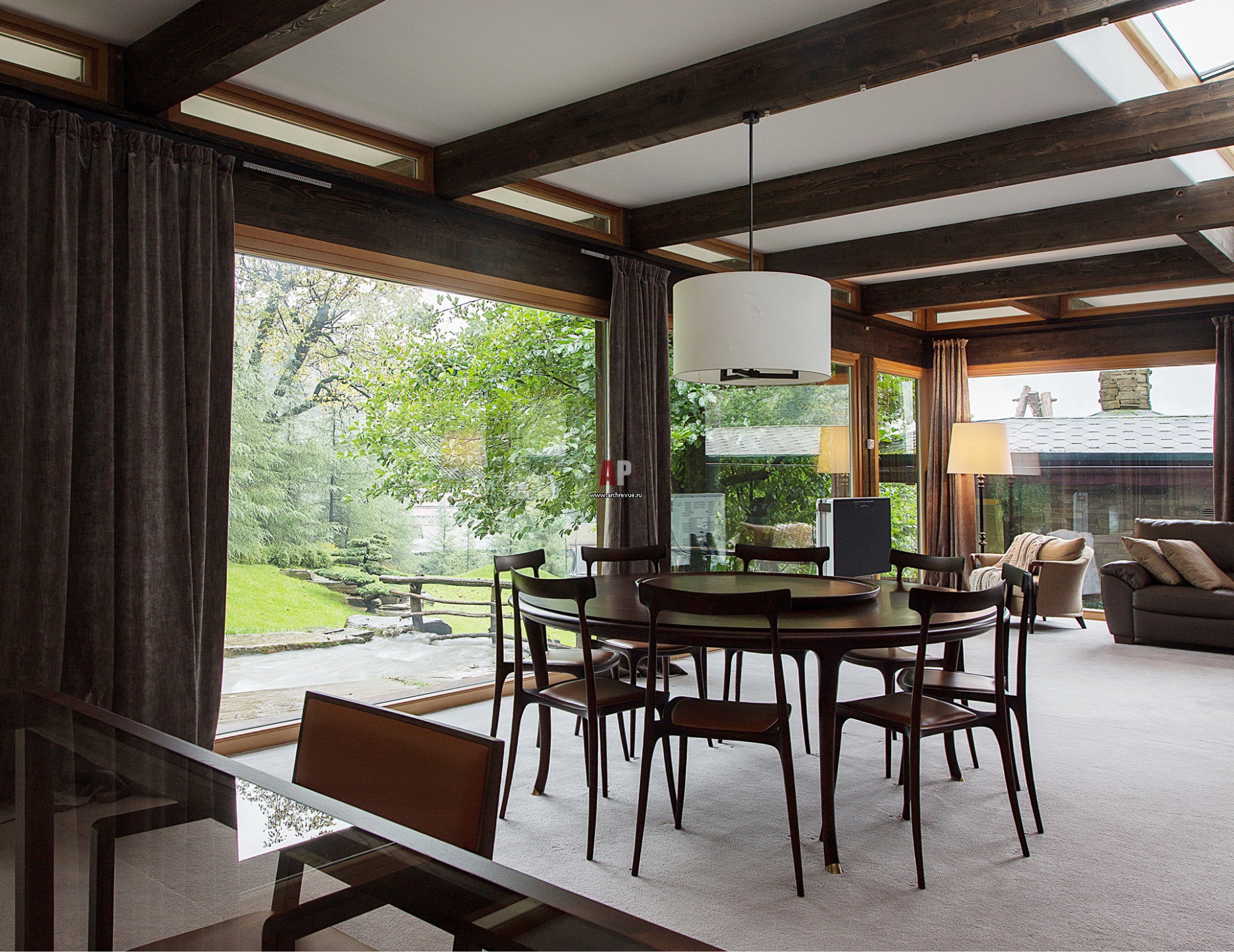 Панорамное остекление немецкое. Верхние, расположенные под наклоном, секции открываются и обеспечивают приток свежего воздуха, а вместе с ними и потрясающих запахов и природных шумов. Дом оснащен системой «умного дома».