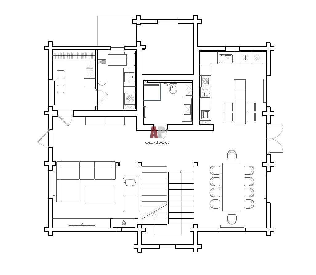 Планировка первого этажа двухэтажного шале в Подмосковье. Общая площадь – 200 кв. м.