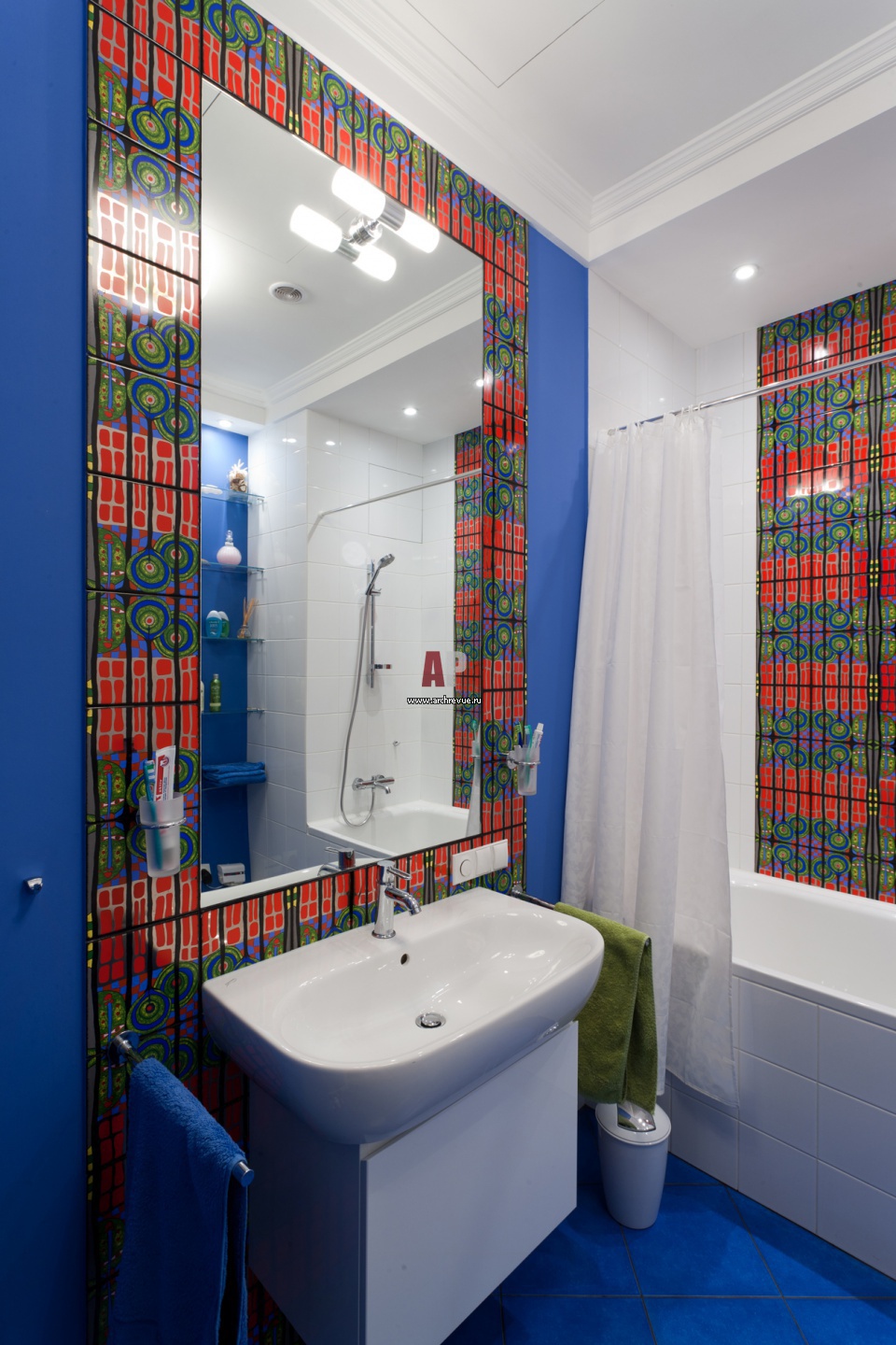 Детский санузел оформлен плиткой, созданной по мотивам работ австрийского художника и архитектора Фриденсрайха Хундертвассера.