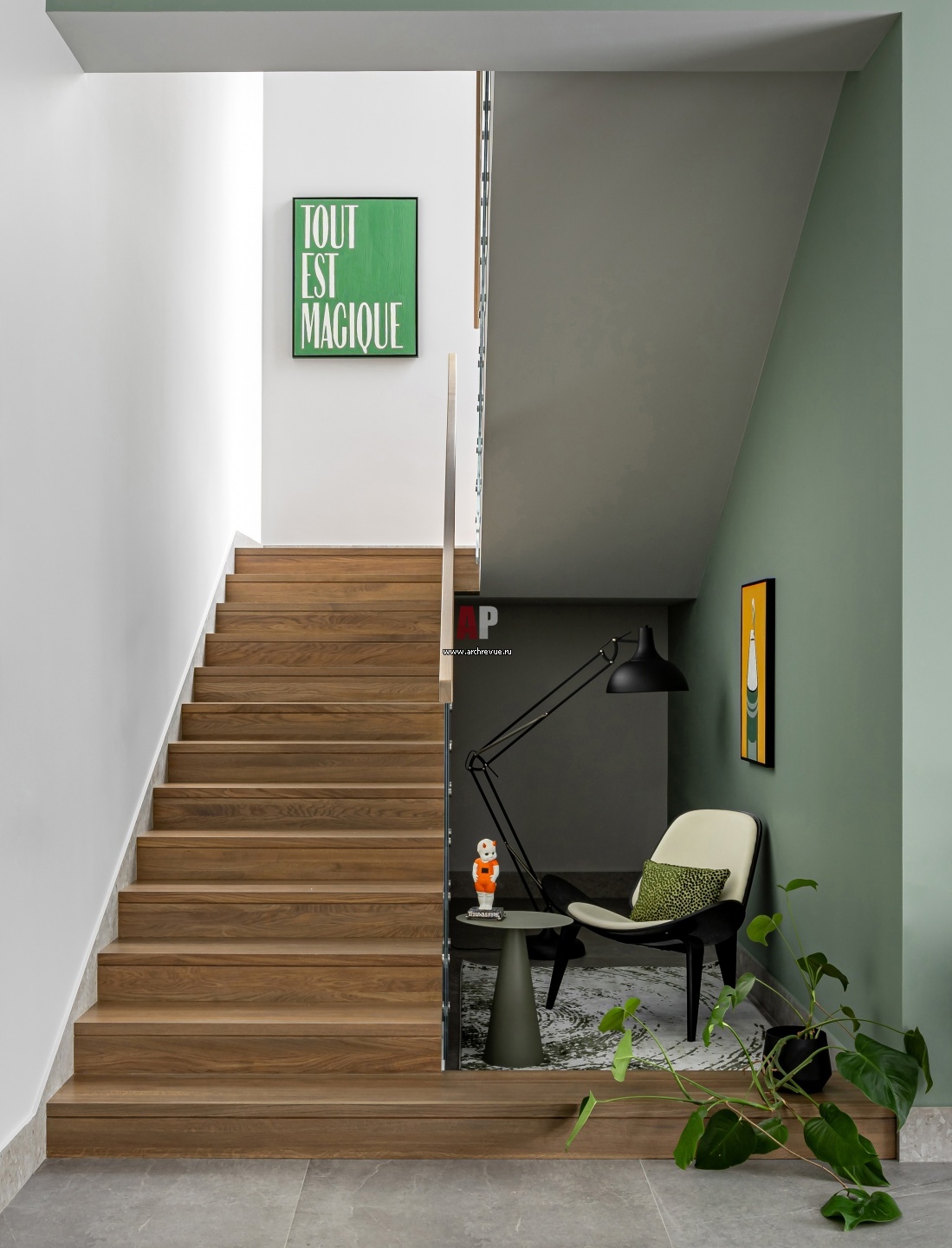 Лестница на второй этаж интегрирована в общую гостиную первого этажа. Ступени и перила из светлого дерева, ограждение стеклянное. Под лестницей организована небольшая зона для чтения с необычной курительницей для благовоний.