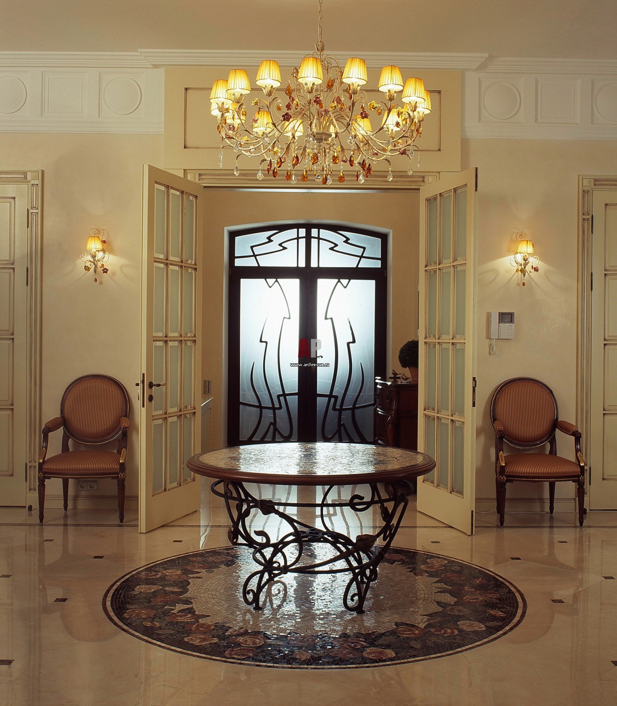Входная зона выполнена в пастельных тонах, украшена лаконичным лепным фризом и широкими дверными порталами. Двери из выбеленного дерева с фацетными стеклами производства Bamax.