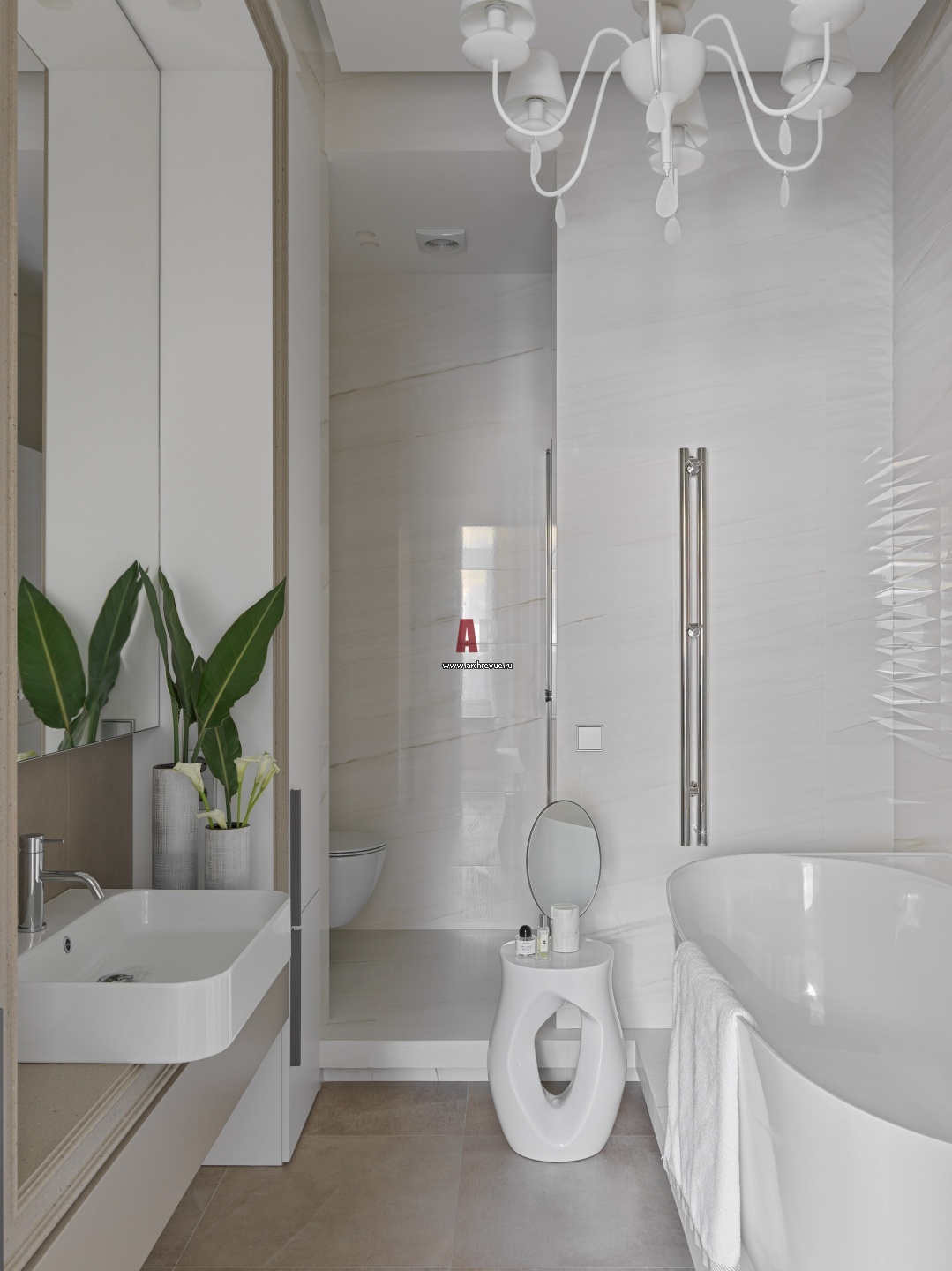 Ванная комната при спальне изначально имела неправильную форму: пространство получилось узким и вытянутым. Светлая плитка с рельефом, зеркала и освещение помогли решить эту проблему. Сантехника, Cristina Rubinetterie. Приставной столик, Duravit.