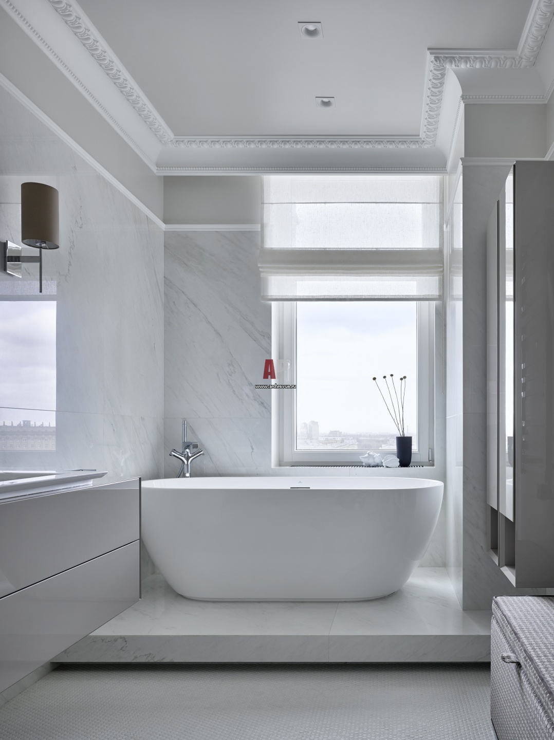 Ванная при спальне хозяев. На подиуме из керамогранита у окна установлена ванна, Noken. Зеркало, Duravit. Стены и пол – керамогранит, Porcelanosa. Бра, Astro.