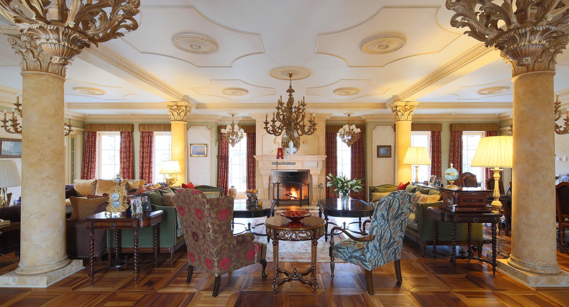 Парадная гостиная выполнена в замковом стиле. Ее интерьер создавался под впечатлением от поездки заказчицы по маленьким средневековым городам Франции. Люстра, Chelini. Торшеры, Silvano Grifoni. Кресла с разноцветной обивкой, Lillian August.