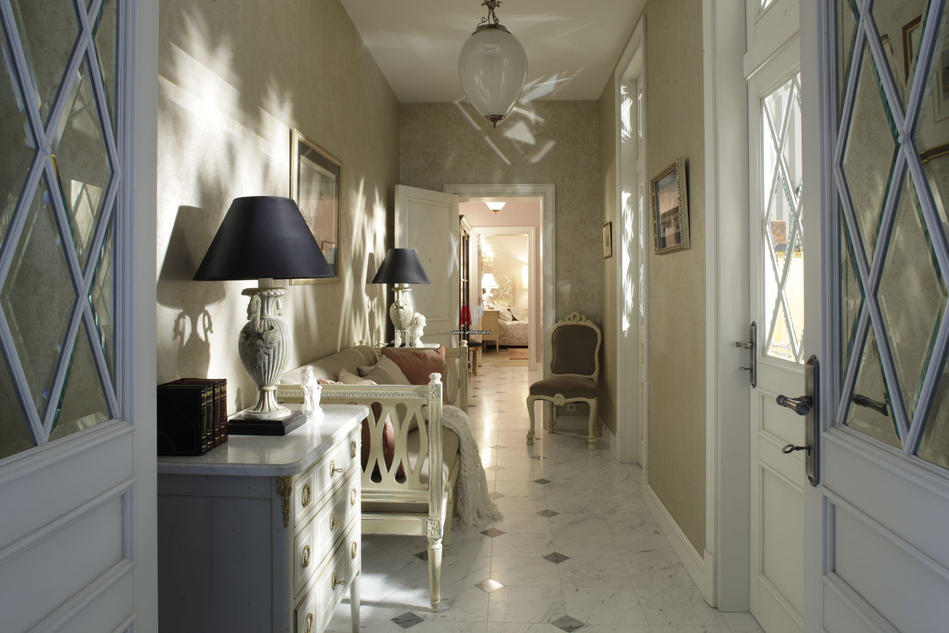 Коридор на втором уровне соединяет приватные помещения. Находка дизайнера – двери с переплетами из фацетного стекла выполненные на фабрике A.B.Italia по эскизам автора проекта. В солнечный день они «пускают» на пол и стены красивые блики. Кушетка Moissonnier в стиле ампир выполнена на заказ. Люстра Mathieu Lustrerie.