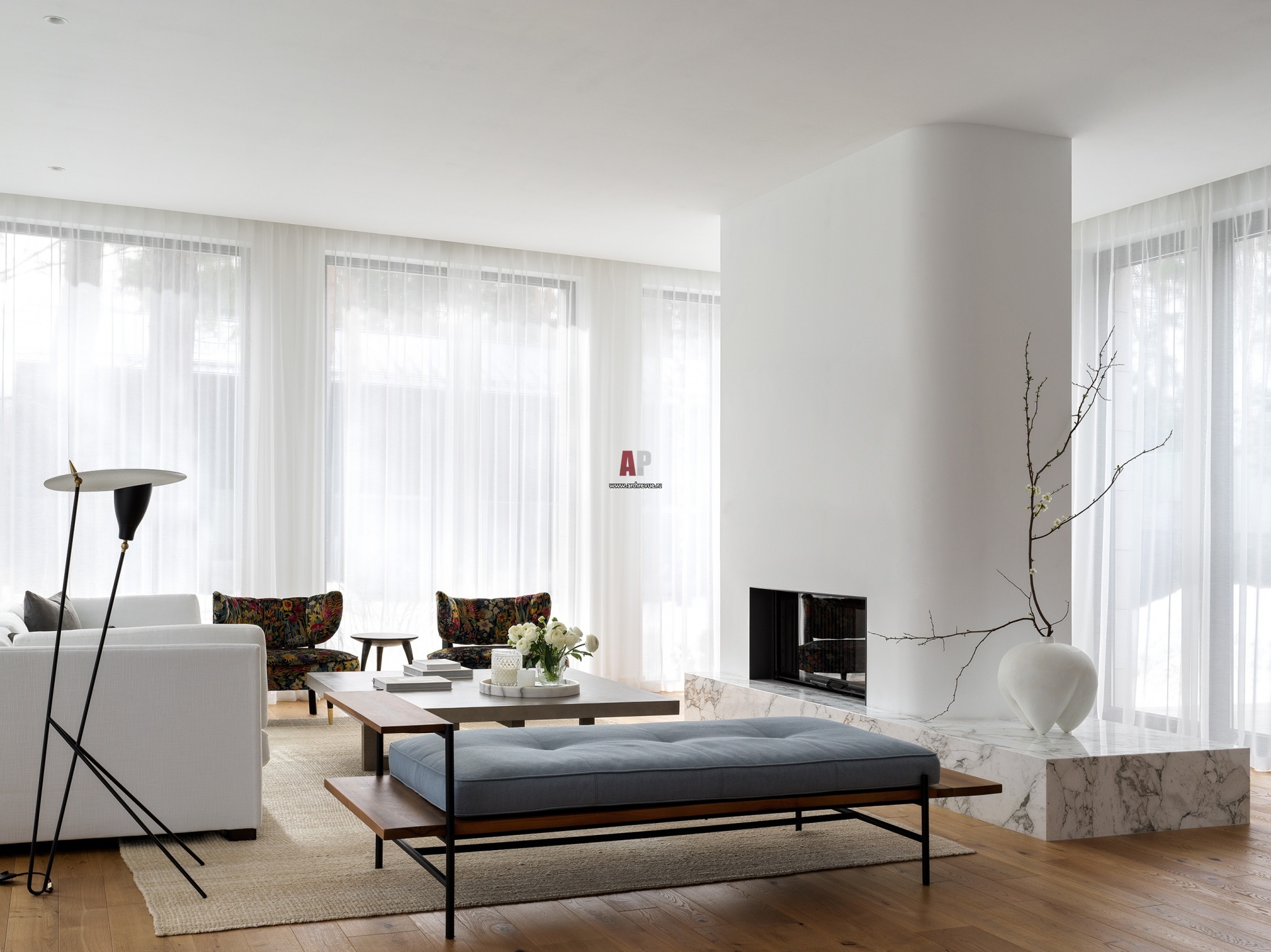 Гостиная с камином. Диван, кофейный стол, Restoration Hardware. У окна – два кресла, DeMuro Das в обивке бархатом Liberty Home. Кушетка, Versant Edition. Торшер, Warm Nordic.