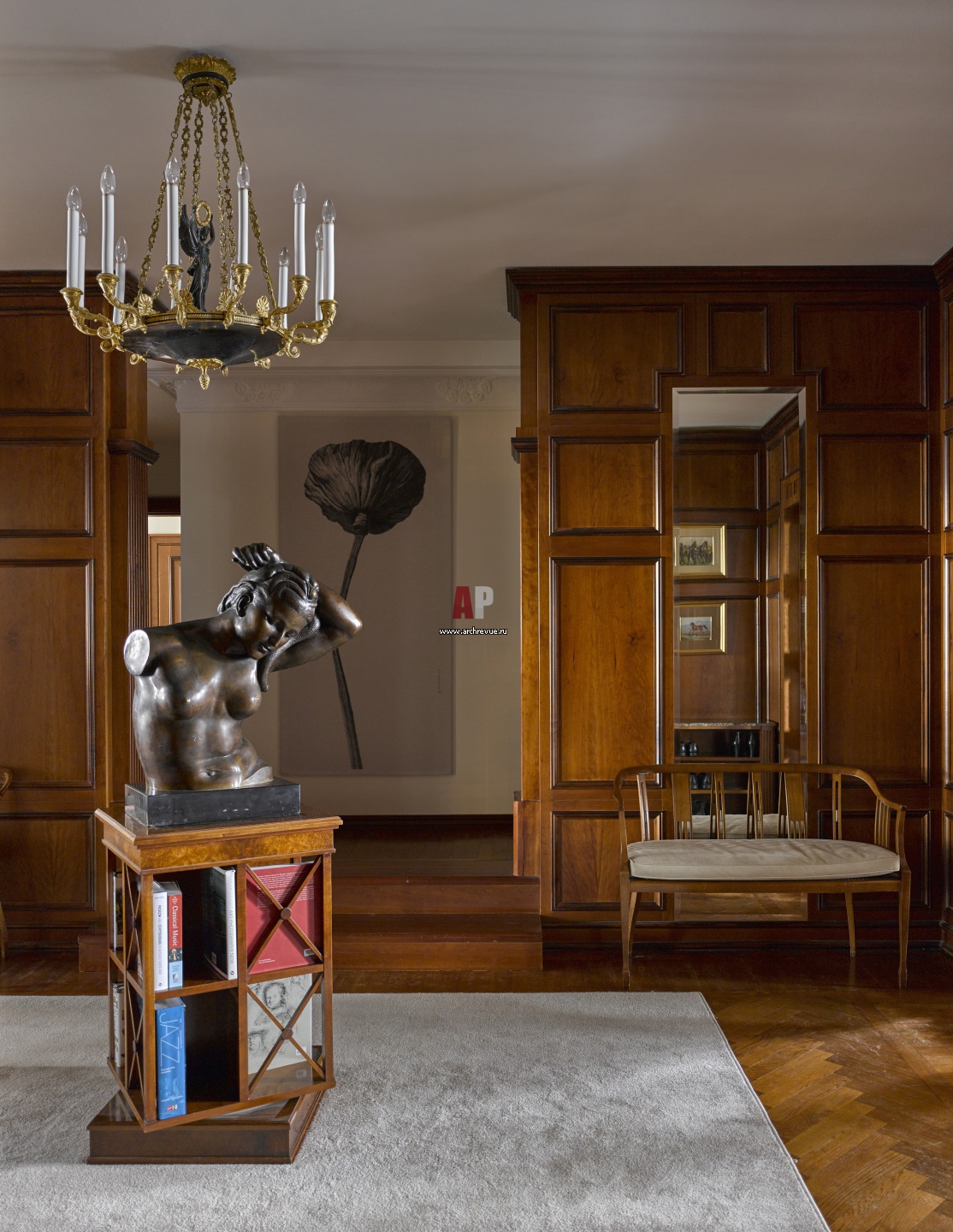 Интерьер центрального холла с коридором, ведущим в блок приватных помещений. Современную ноту в интерьер привносит картина «Лотос» китайского художника Чжао Сюя. Люстра, Laudarte. Стеновые панели-буазери изготовлены в Италии.