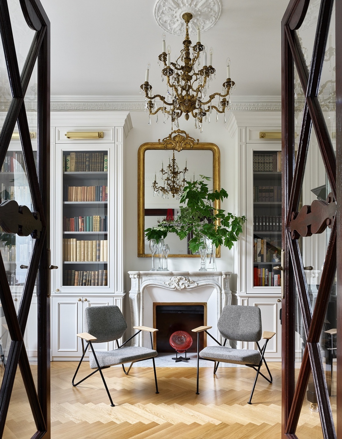 Музыкальный салон с камином. Каминный портал из мрамора антикварный, Франция XIX век. Зеркало в золоченой раме, антиквариат, Франция, XIX век, Книжные шкафы сделаны на заказ по эскизам дизайнера. Кресла у камина, Vitra, модель Prostoria Poligon. Люстра, антиквариат, Франция, 1940-е годы, хрусталь, бронза.
