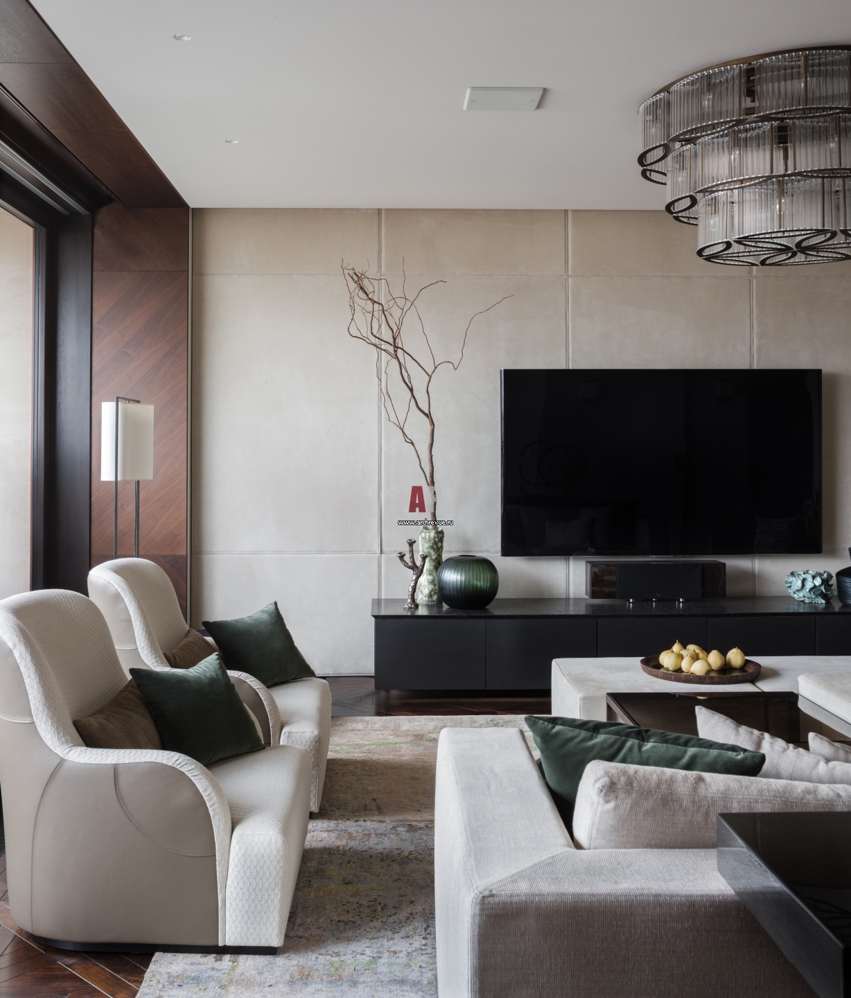 Интерьер парадной гостиной цвета кофе с молоком в 3-х этажном пентхаусе. Текстиль, BoConcept.