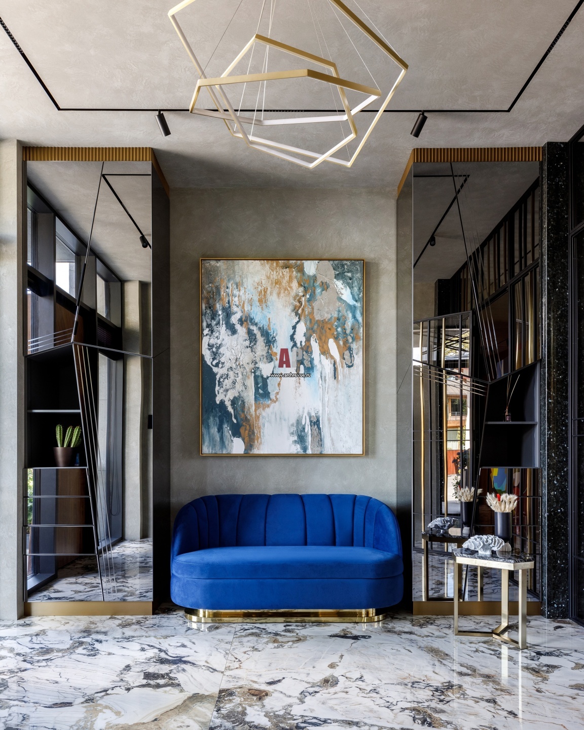 Прихожая площадью 11 кв. м. Через остекленные перегородки свет попадает в пространство холла. Ритм задан из чередующихся вертикальных раскладок разных материалов: стекла, зеркал, камня, латунных решеток.