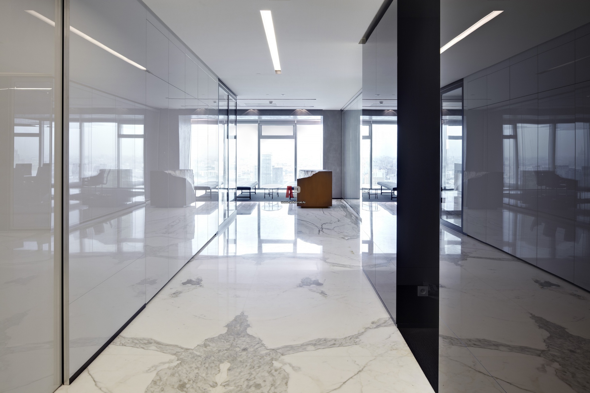 Фото интерьера офиса в стиле минимализм. Глянцевые поверхности белого и черного цвета, стеклянные перегородки, фактура природного камня – характерные особенности проекта.