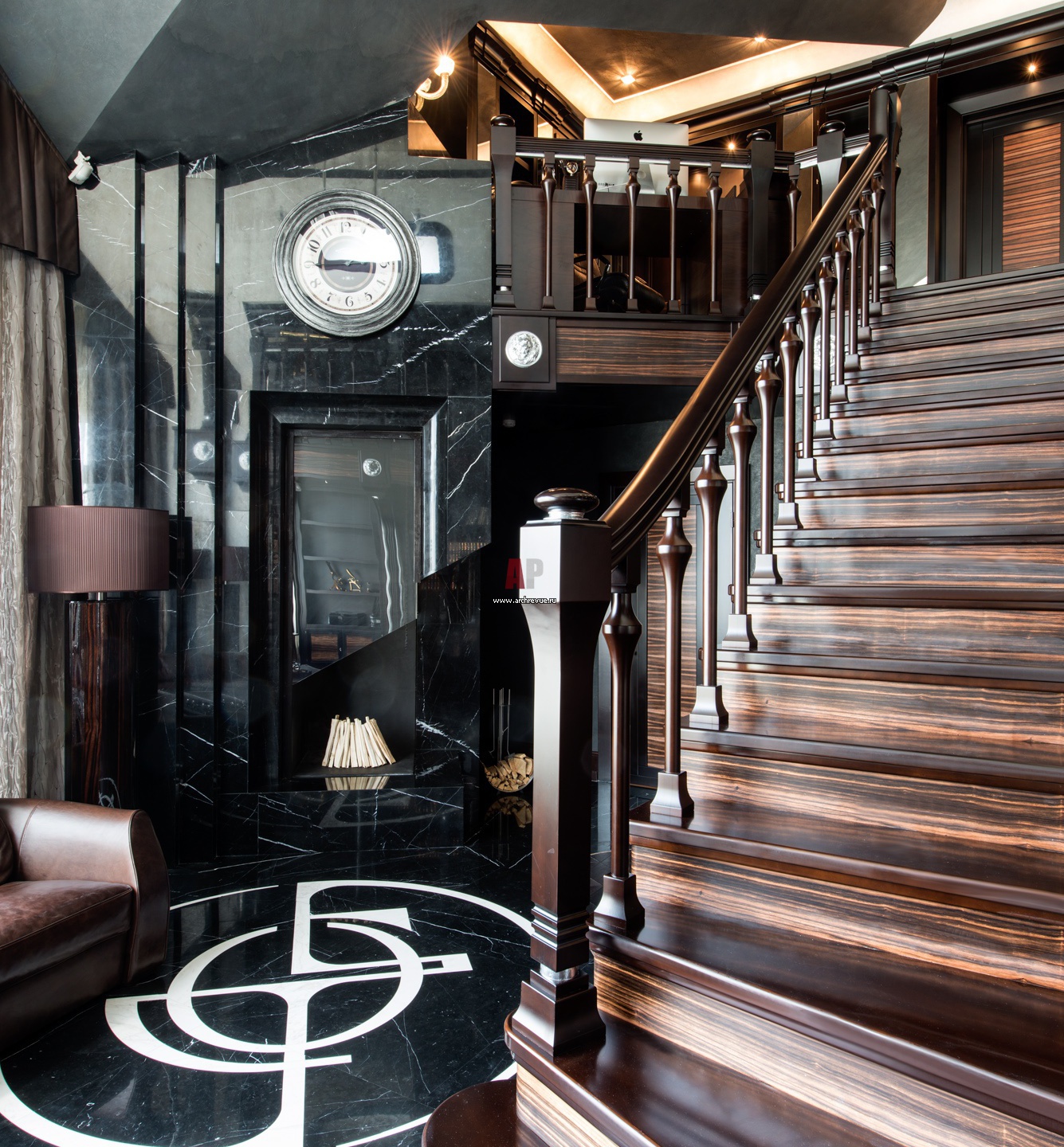 Фото зоны камина в интерьере мужского особняка. Камин из черного мрамора исполнен как часть конструкции лестницы и балкона второго этажа. В оформлении топки использовано черное закаленное стекло.