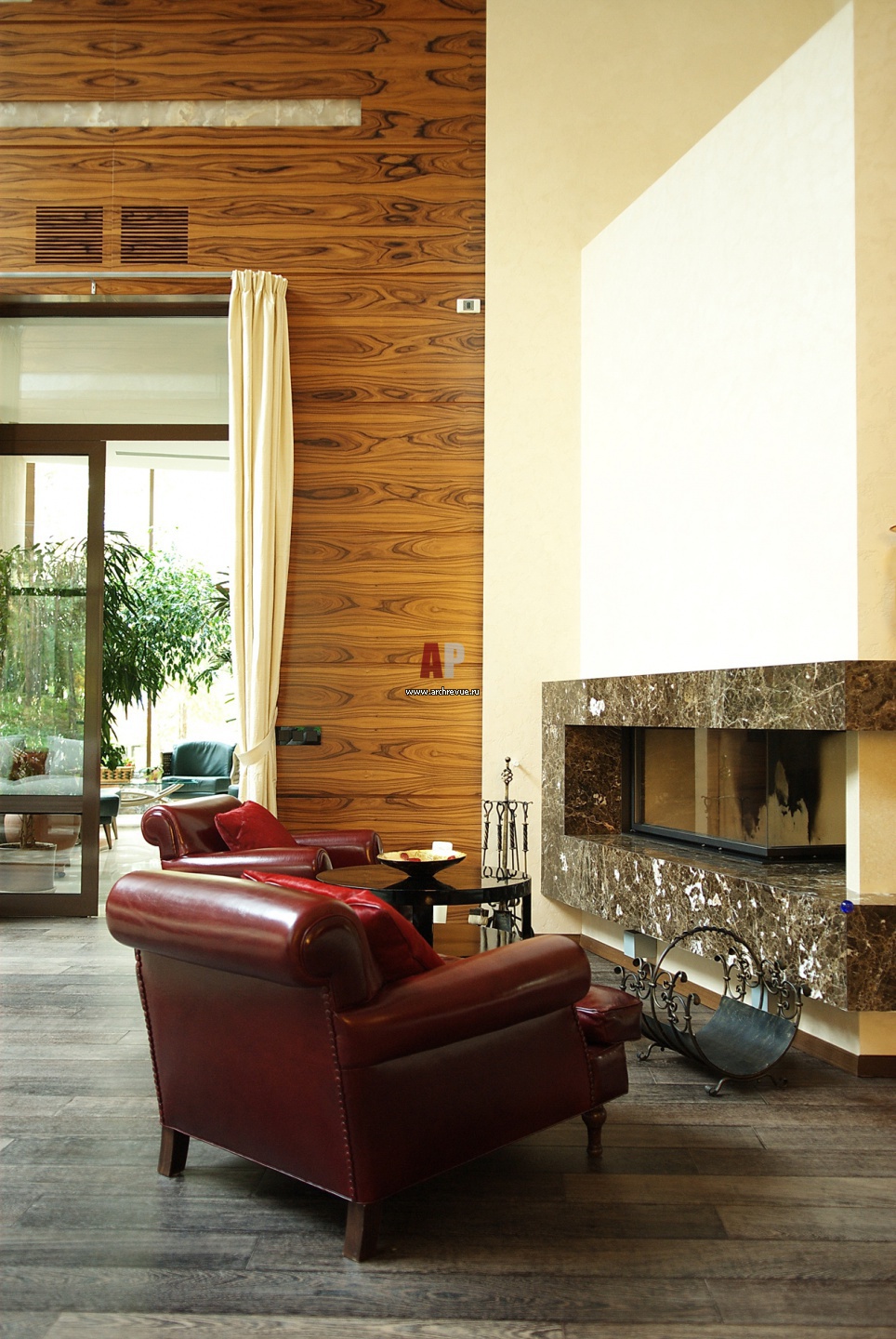 Полутораметровая топка камина вытянута по горизонтали и отделана полированным мрамором сорта «Имперадор».
